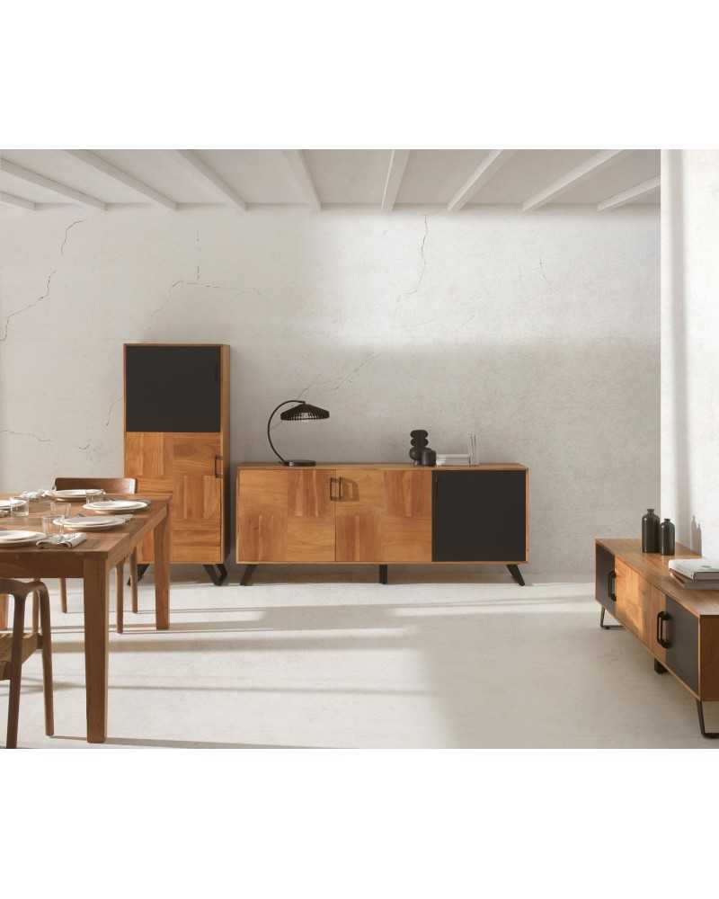 Aparador de diseño moderno con tres puertas, acabado en madera natural y detalle en negro. Ideal para salones contemporáneos, ofrece gran capacidad de almacenaje y destaca por su elegante combinación de materiales y líneas rectas. Perfecto para aportar estilo y funcionalidad al hogar.