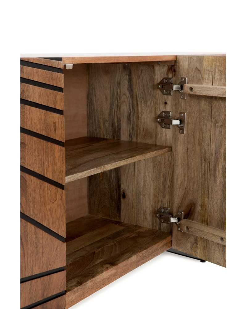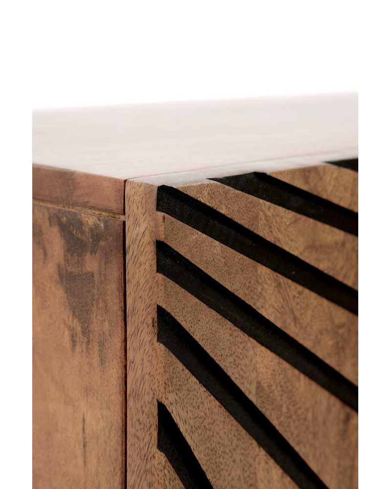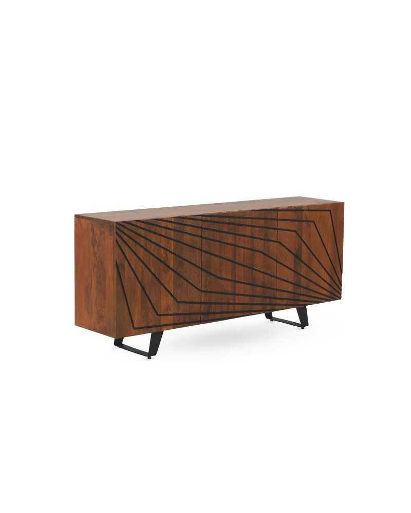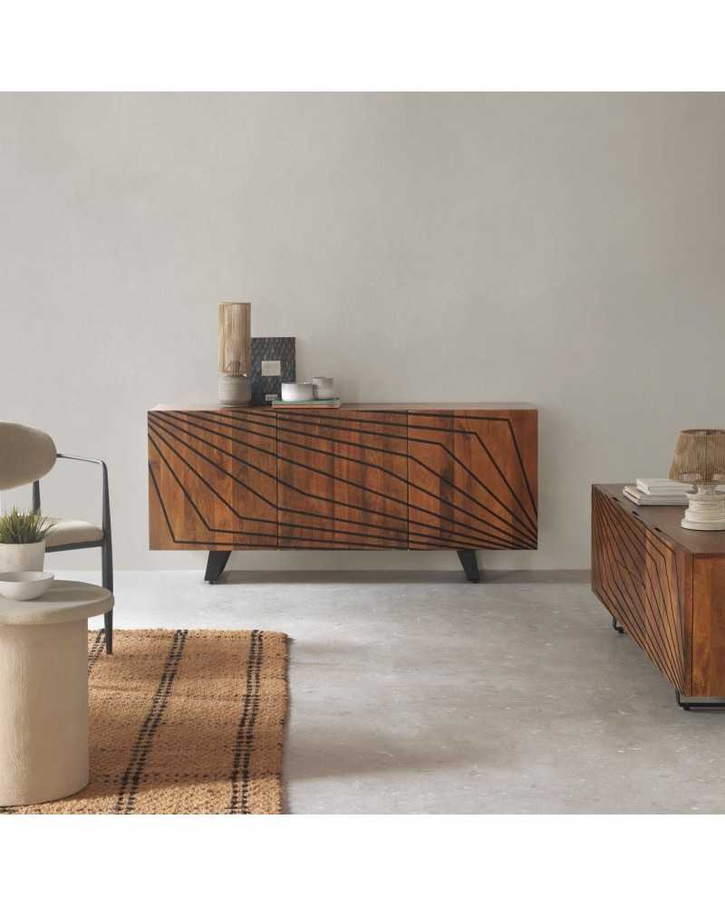 El aparador mostrado en la imagen es una pieza de mobiliario contemporáneo fabricada en madera, con un acabado natural que resalta las vetas del material. Dispone de tres puertas de apertura frontal, lo que facilita el acceso a un amplio espacio de almacenamiento interior, ideal para vajilla, libros u objetos decorativos. Su diseño destaca por la presencia de líneas geométricas negras impresas o talladas en el frontal, formando un patrón visual dinámico y moderno. Las patas inclinadas en metal negro aportan estabilidad y elevan ligeramente el mueble, confiriéndole un toque ligero y elegante, muy adecuado para ambientes de estilo moderno o industrial.