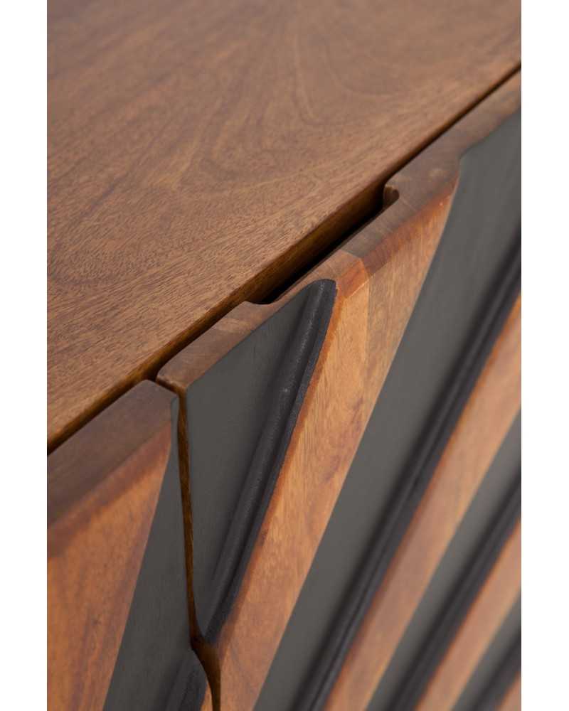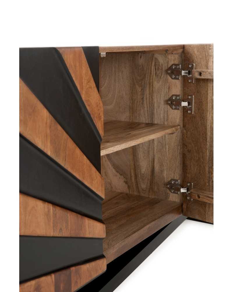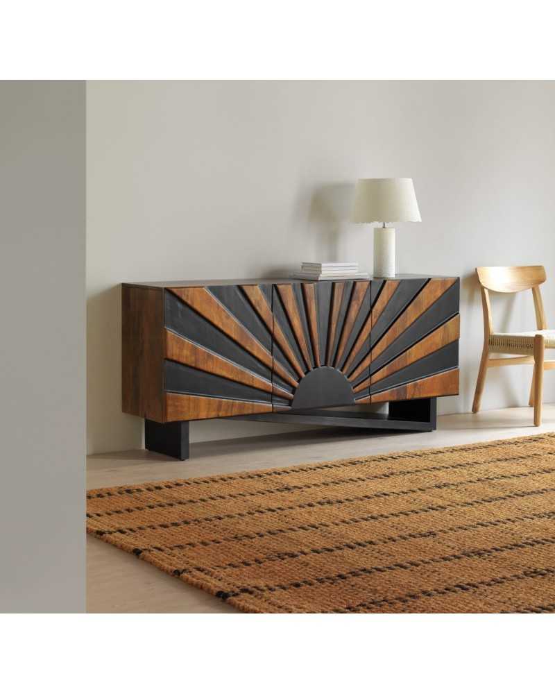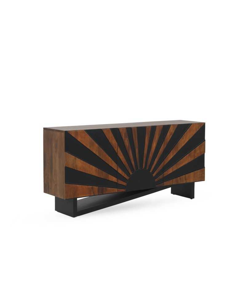 Aparador de diseño geométrico en madera y negro, inspirado en un amanecer. Ideal para salones modernos, combina funcionalidad y arte en una pieza única que aporta carácter y sofisticación a cualquier espacio.