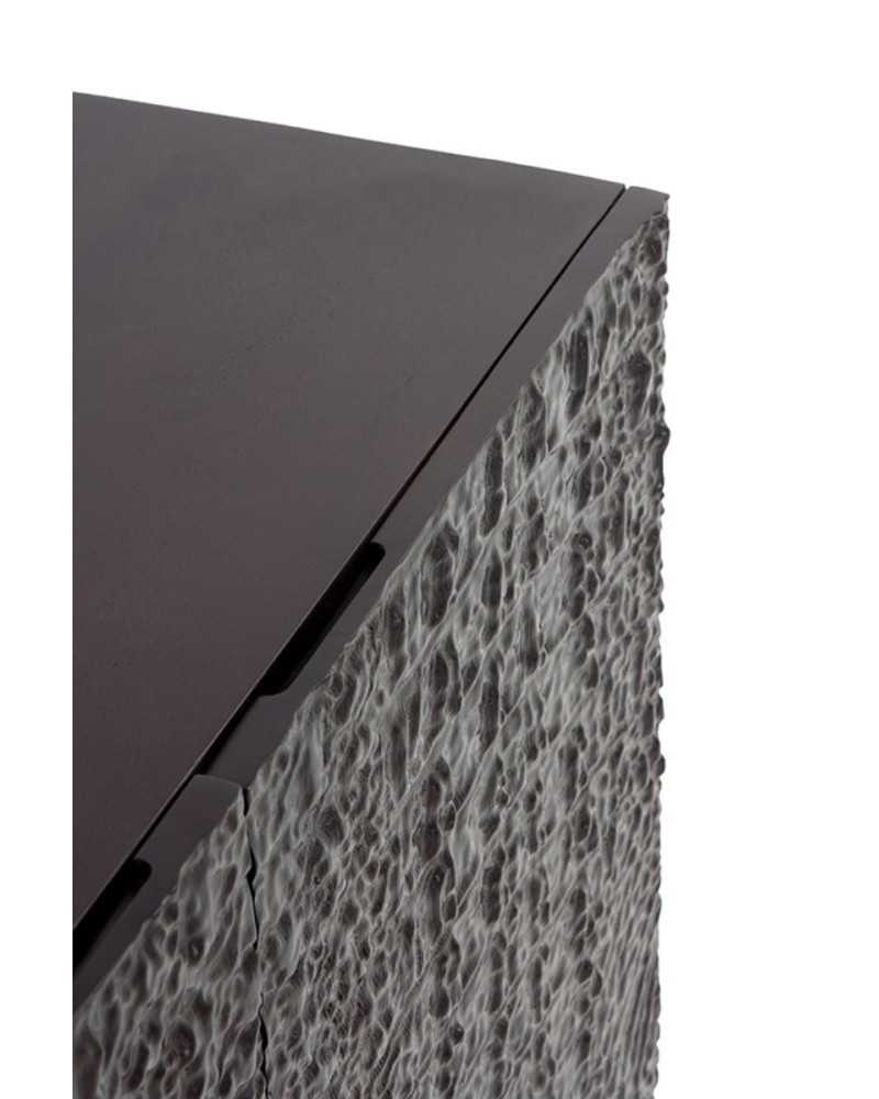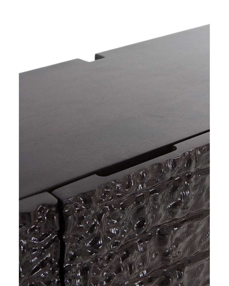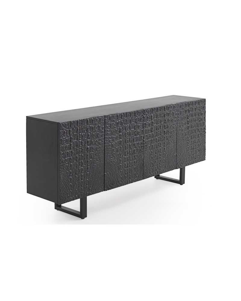 Aparador moderno de diseño minimalista, fabricado con estructura de madera y acabado en color mate. La característica principal de este mueble es el relieve texturizado de las puertas, que imita la piel de cocodrilo, aportando sofisticación y un toque exótico al ambiente. El aparador se sustenta sobre patas metálicas cuadradas, lacadas también en negro para mantener una estética uniforme y elegante. Su diseño geométrico y líneas rectas lo hacen ideal para espacios contemporáneos, ofreciendo gran capacidad de almacenamiento interno y funcionalidad gracias a sus puertas sin tiradores visibles, que favorecen una apertura limpia y discreta.