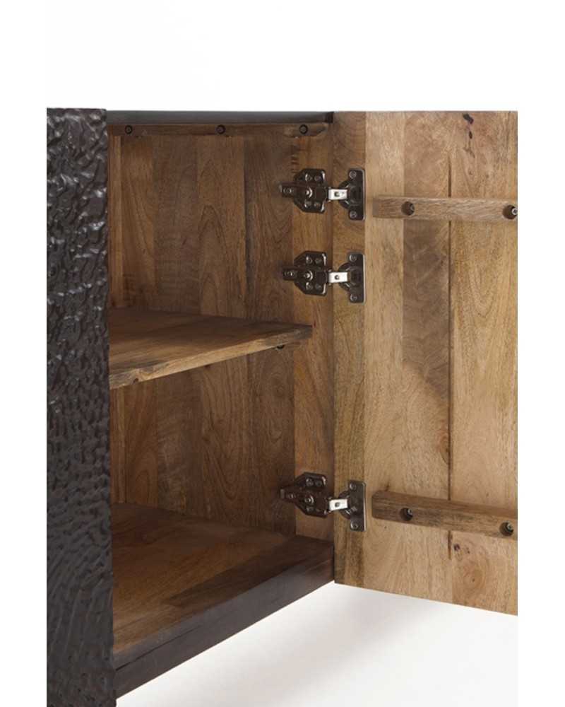 • Material: Madera maciza de mango para el cuerpo, chapa de MDF para la trasera y estructura metálica en negro con recubrimiento en polvo. • Patas: Metálicas, en forma de U, color negro. • Frente: Textura que imita la piel de cocodrilo, elaborada artesanalmente, con acabado brillante. • Puertas: Cuatro puertas con bisagras de cierre suave y tiradores tipo uñero para una apertura cómoda y silenciosa. • Interior: Incluye un estante fijo a media altura en cada compartimento, creando dos espacios independientes tras las puertas. • Mantenimiento: Limpiar con paño húmedo; evitar productos abrasivos y exposición directa prolongada al sol. Se recomienda colocar protectores en las patas para evitar daños en el suelo. • Cada aparador es único, ya que la madera de mango presenta variaciones naturales y el trabajo artesanal de las puertas asegura un acabado exclusivo. • Diseño pensado para combinar funcionalidad y estética, aportando gran capacidad de almacenaje y siendo un punto focal decorativo en cualquier espacio.