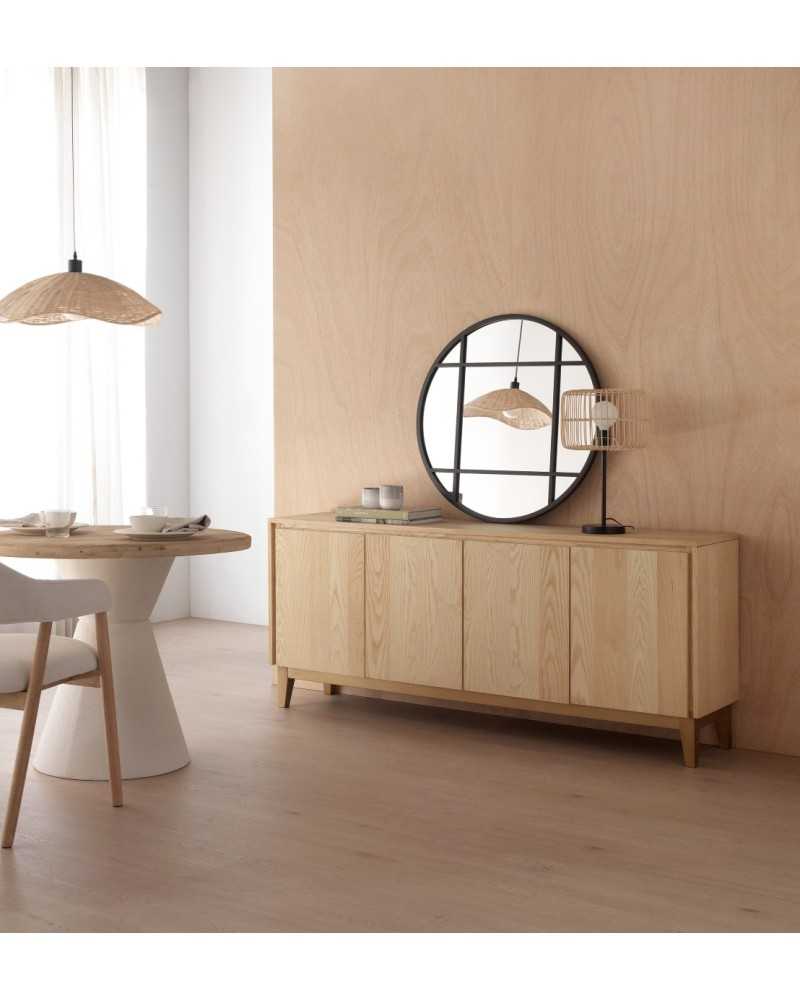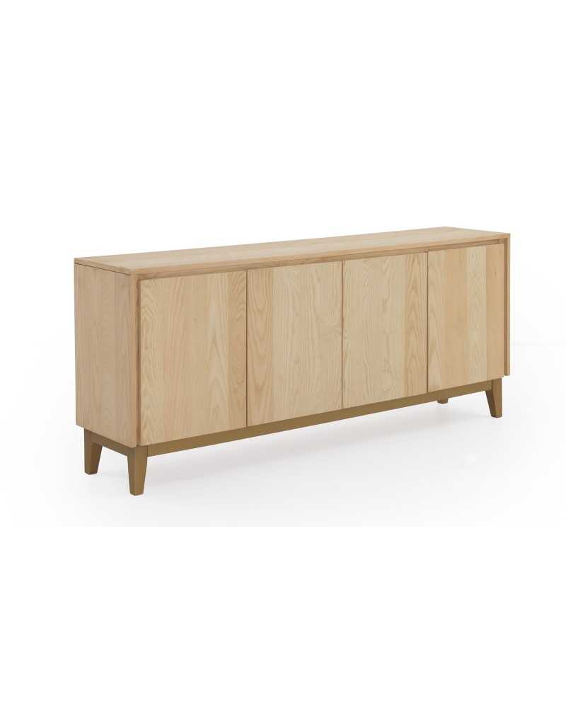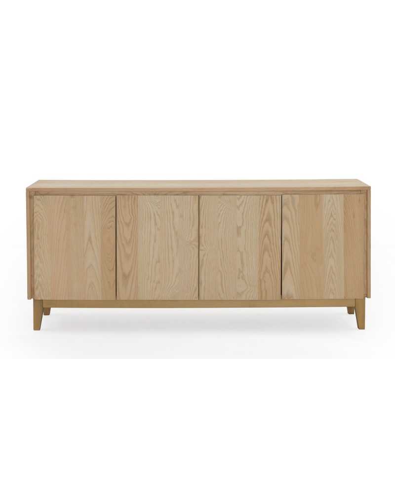 Aparador de diseño contemporáneo fabricado en madera maciza de fresno, con acabado natural que resalta la veta y aporta calidez al ambiente. Su estructura robusta y líneas rectas transmiten una estética minimalista y funcional, ideal para entornos modernos. Dispone de cuatro puertas con sistema de apertura push, lo que elimina tiradores y refuerza el diseño limpio. El interior ofrece amplio espacio de almacenamiento, lo que lo hace perfecto para guardar vajilla, textiles o accesorios. Las patas ligeramente elevadas mejoran la ventilación y facilitan la limpieza en la parte inferior, además de aportar ligereza visual al conjunto.