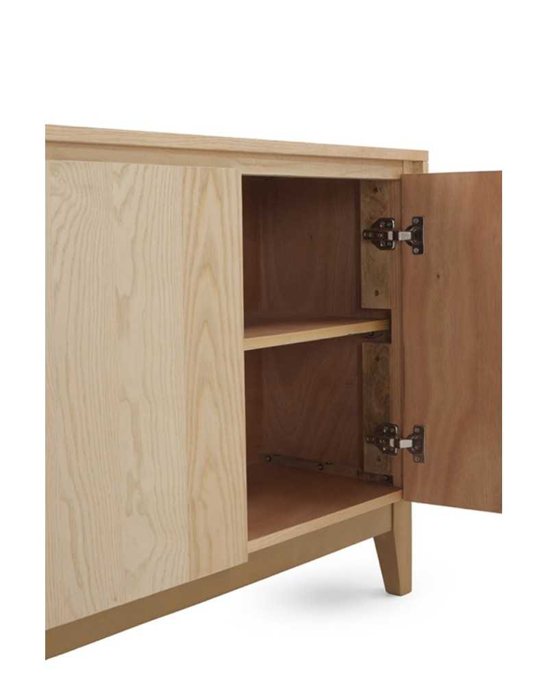 Aparador de fresno de diseño minimalista, acabado en madera natural. Ideal para salones modernos, aporta calidez y funcionalidad con gran capacidad de almacenamiento y líneas elegantes. Perfecto para crear un ambiente acogedor y sofisticado en tu hogar.