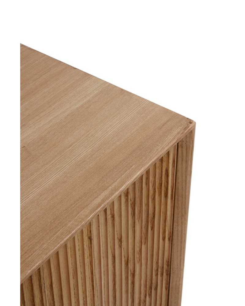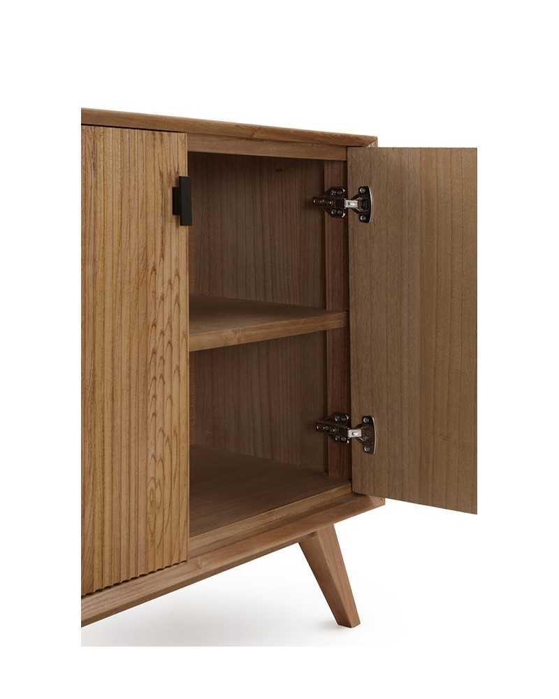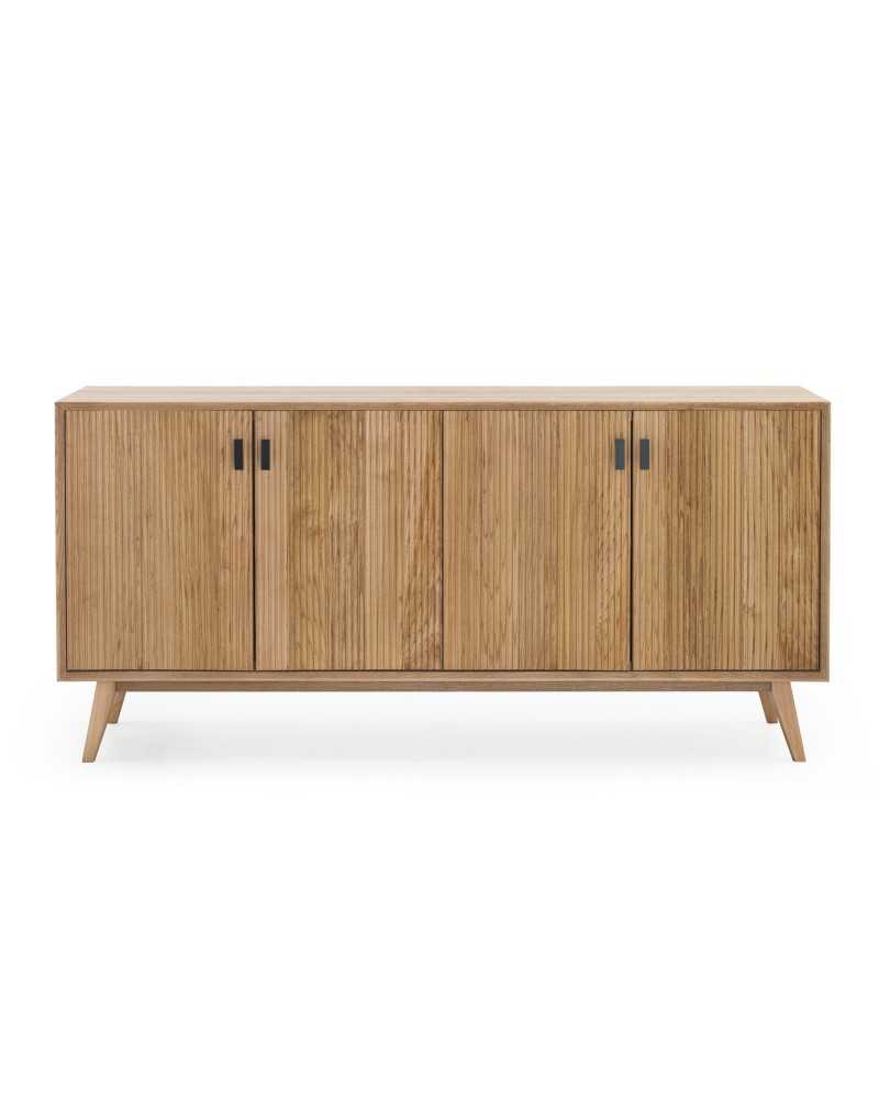 Aparador de cuatro puertas fabricado en madera natural, acabado barnizado mate que resalta la veta y textura original. El diseño es de líneas rectas y estilo contemporáneo, con puertas frontales decoradas mediante un relieve vertical que aporta dinamismo visual. El mueble se apoya sobre patas inclinadas, también de madera maciza, que garantizan estabilidad y permiten fácil limpieza bajo la estructura. Los tiradores metálicos en negro aportan un contraste sutil y moderno. Es ideal para salones o comedores, brindando amplio espacio de almacenamiento interior para vajilla, mantelería u otros objetos del hogar, combinando funcionalidad con elegancia decorativa.