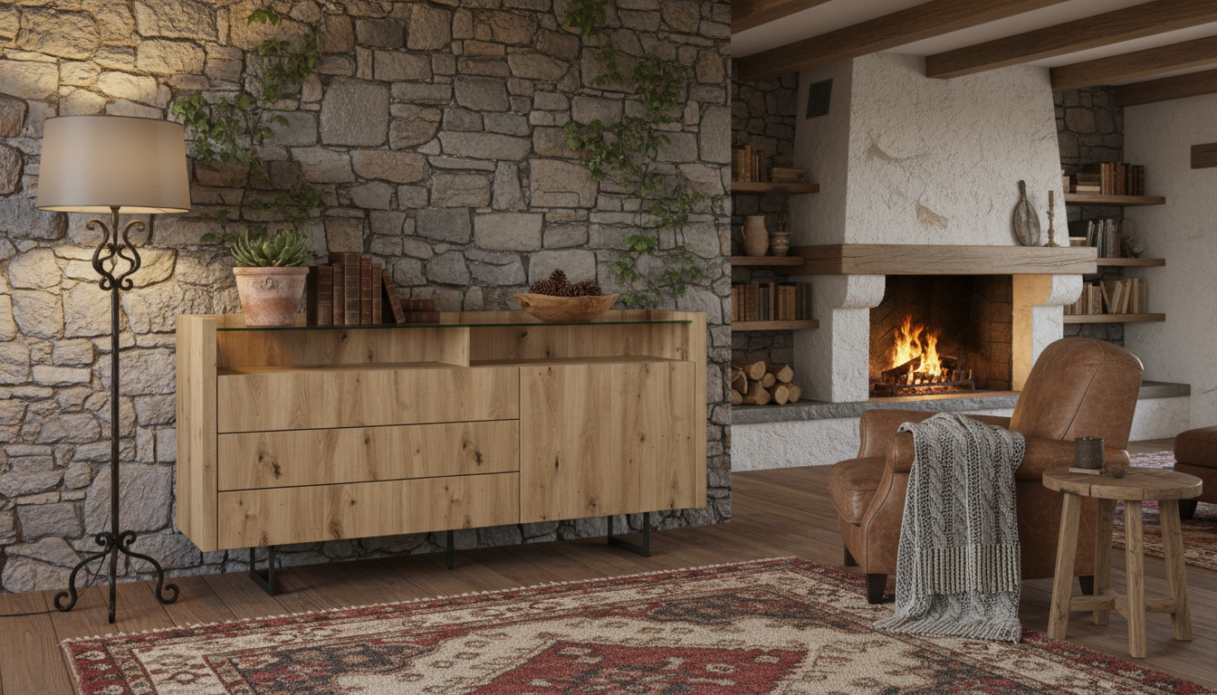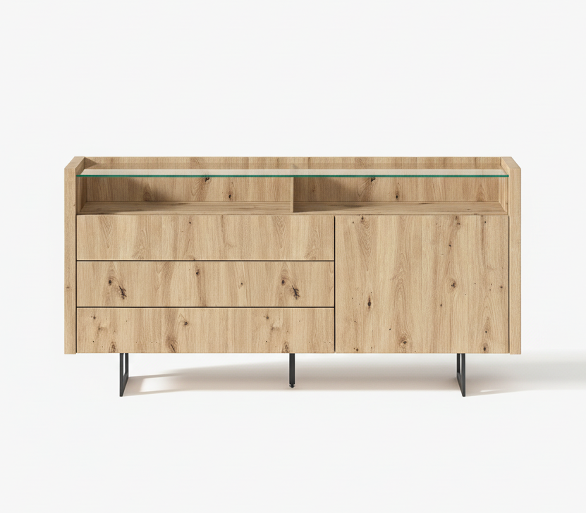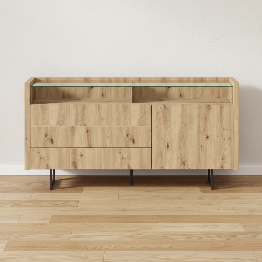 Aparador moderno de roble artesano con encimera de cristal, cajones laterales y compartimentos abiertos. Diseño robusto y elegante para cualquier estancia.