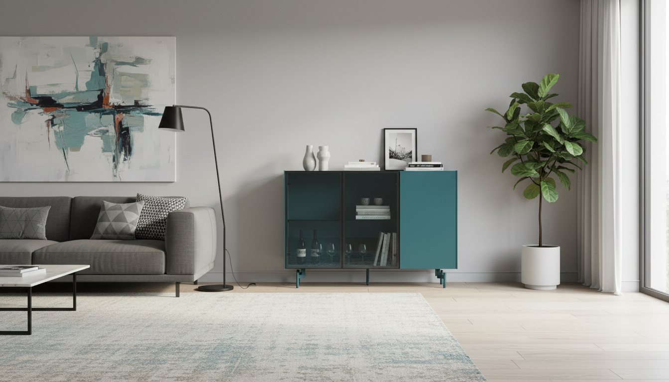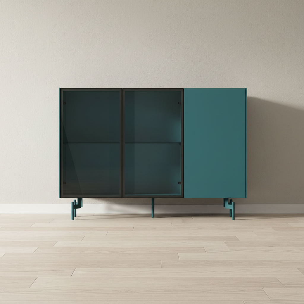 Este aparador destaca por su diseño moderno y asimétrico en verde jungla, ideal para salones contemporáneos. Cuenta con una estructura de melamina premium de alta durabilidad, dos puertas de cristal fumé en el lado izquierdo para exhibir objetos con elegancia, y un módulo cerrado a la derecha en color verde intenso. Las patas metálicas elevadas aportan ligereza visual y estabilidad, mientras que el lateral adicional de 1 cm permite composiciones modulares. Sus proporciones equilibradas (anchura total de 137 cm y altura de 96 cm) lo hacen versátil para espacios medianos.