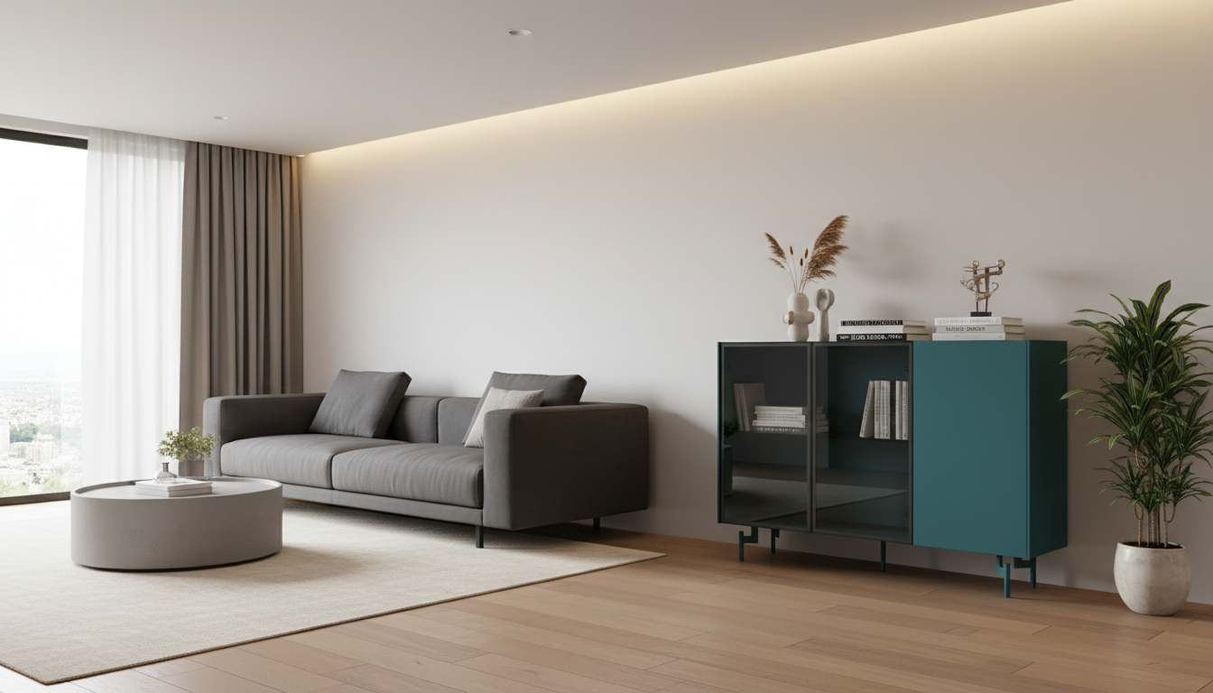 Ofrece almacenamiento versátil con vitrina visible y zona cerrada, diseño asimétrico moderno que ahorra espacio y materiales duraderos para uso prolongado.