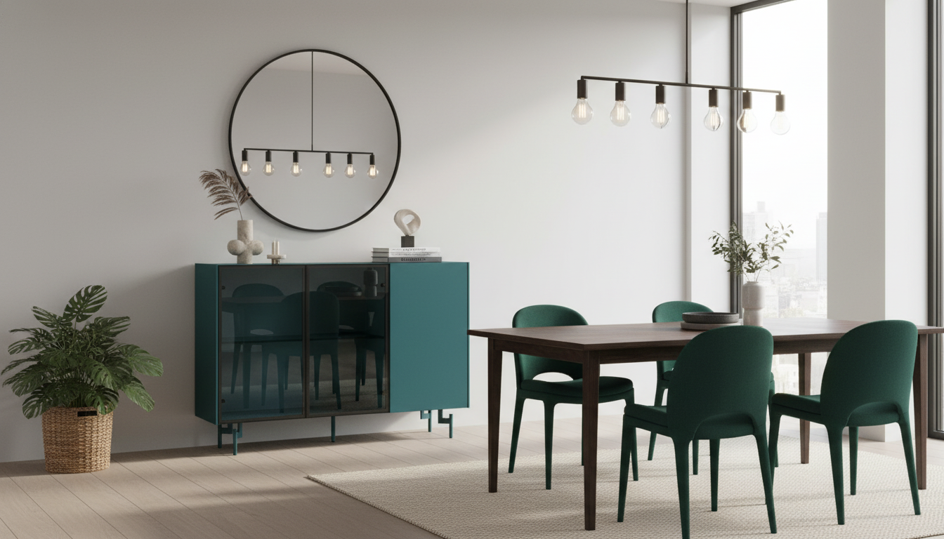 Un aparador moderno en verde jungla con vitrina de cristal y módulo cerrado, elevado sobre patas metálicas para un toque elegante y funcional.