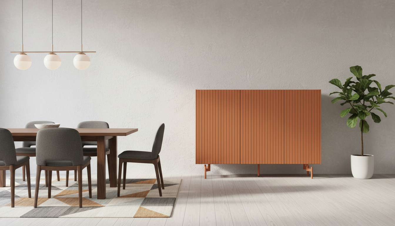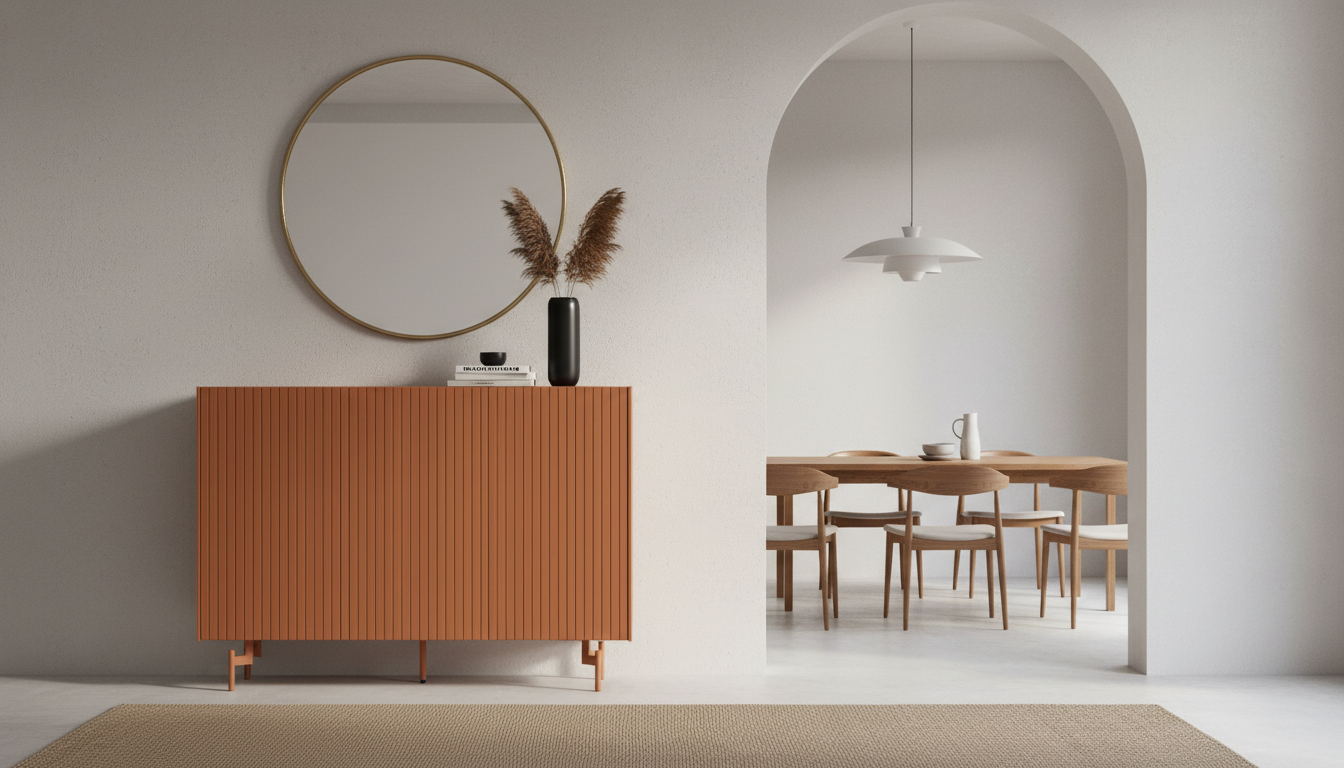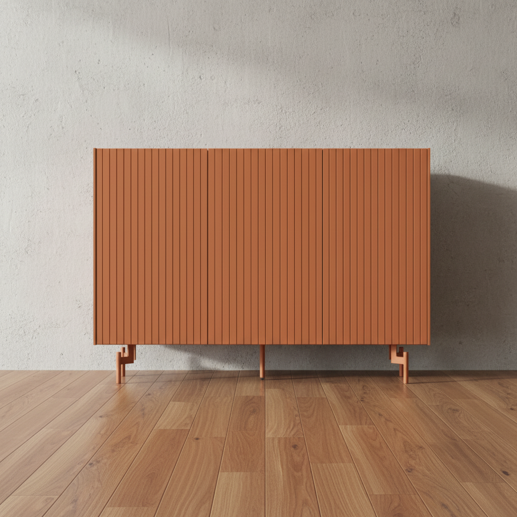 Aparador moderno en terracota con puertas de lamas verticales y patas finas elevadas, perfecto para un almacenamiento sofisticado y aireado en espacios contemporáneos.