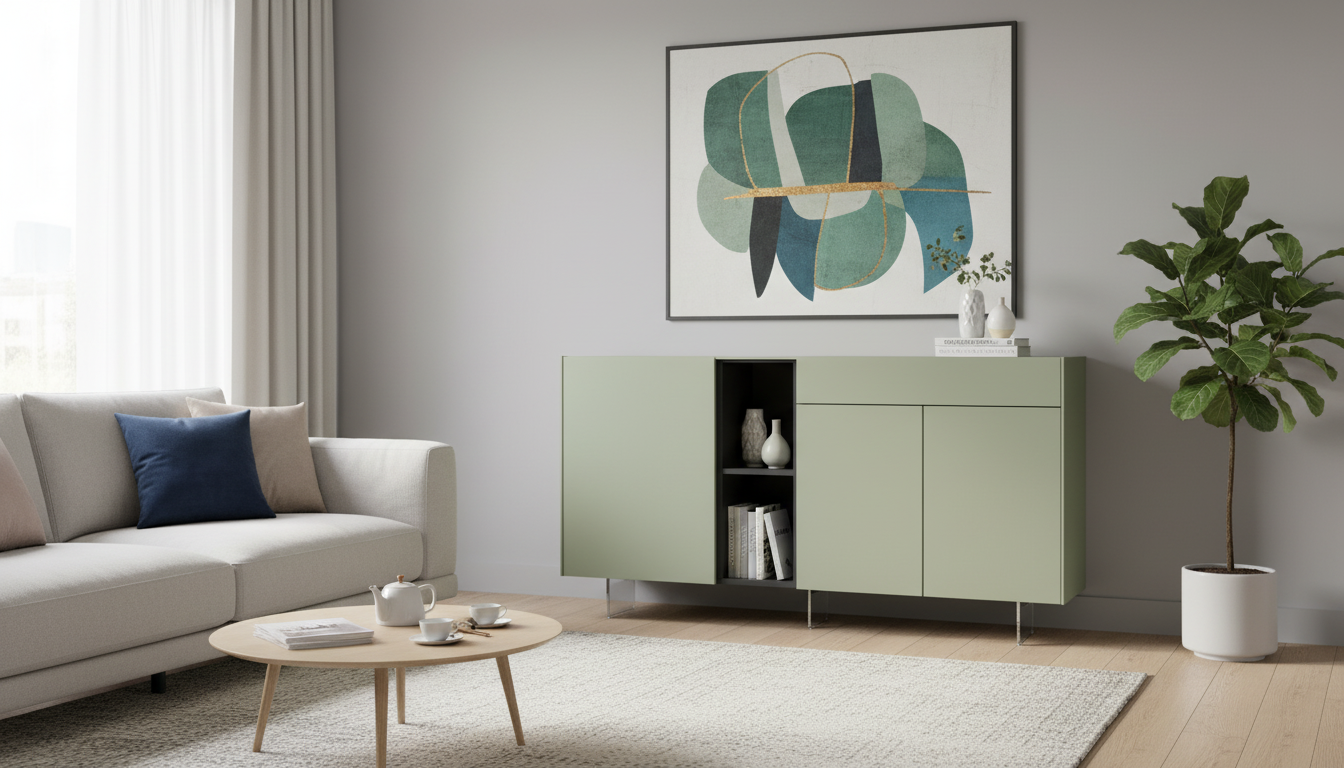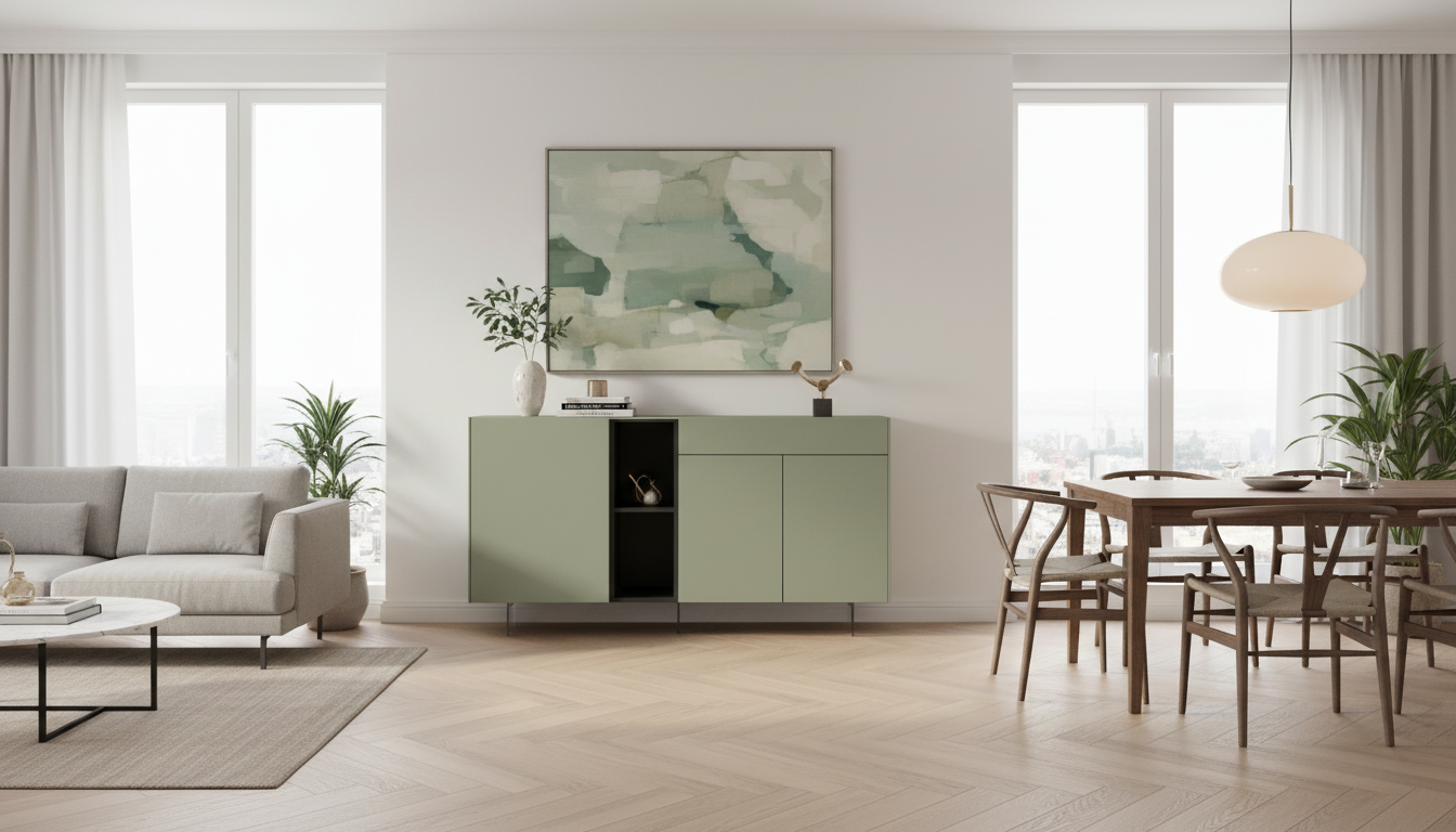Este aparador de líneas rectas y estilo contemporáneo combina el tono gris pizarra con detalles en bambú para crear una pieza sobria, elegante y actual. Su composición visual equilibra zonas cerradas y un módulo central abierto, lo que aporta dinamismo y permite exponer objetos decorativos o guardar elementos de uso diario. La base elevada aporta ligereza visual y facilita la limpieza del espacio inferior, mientras que su diseño horizontal ayuda a integrar el mueble en salones, comedores o espacios multifuncionales con una presencia refinada y discreta.