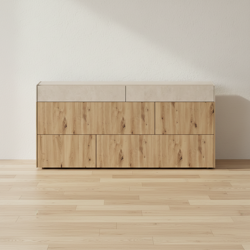 Aparador moderno en roble artesano con vetas marcadas y encimera caliza clara. Cuenta con siete cajones para gran capacidad de almacenamiento y diseño minimalista ideal para salones.