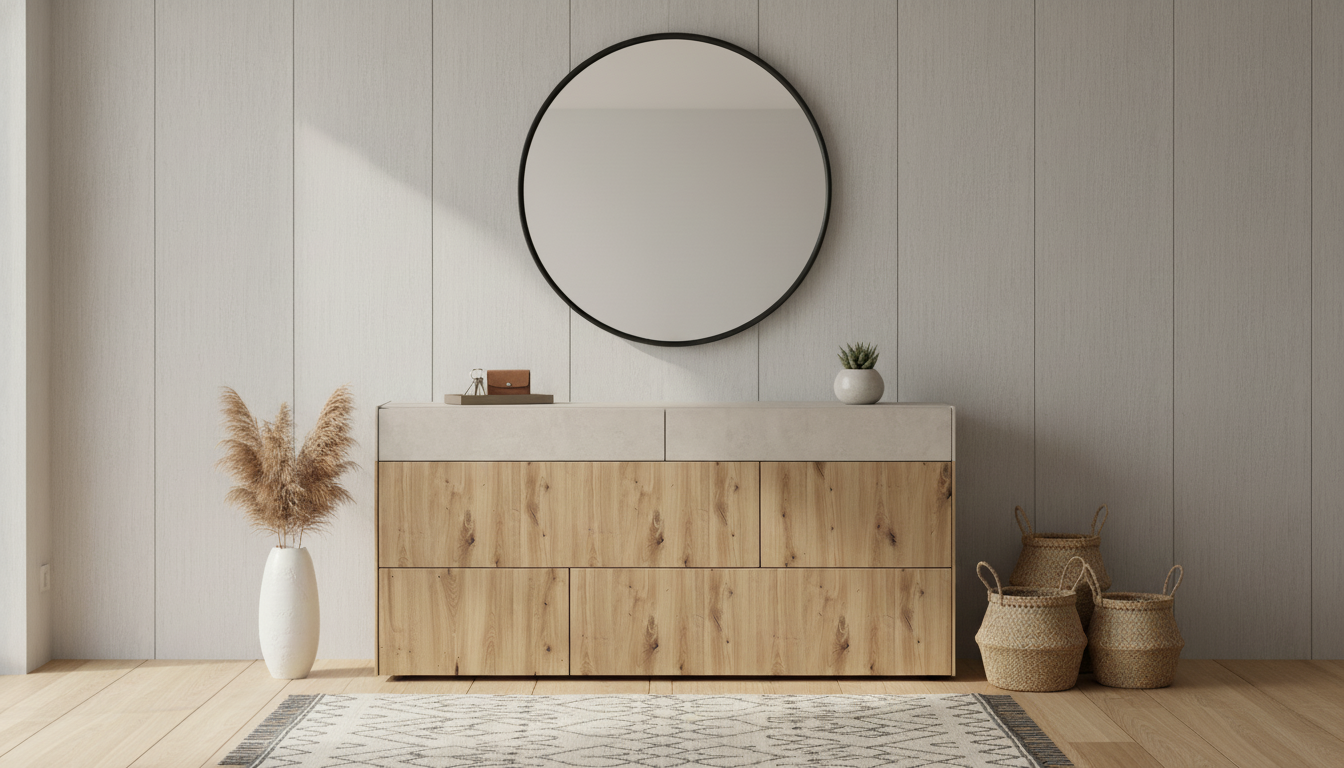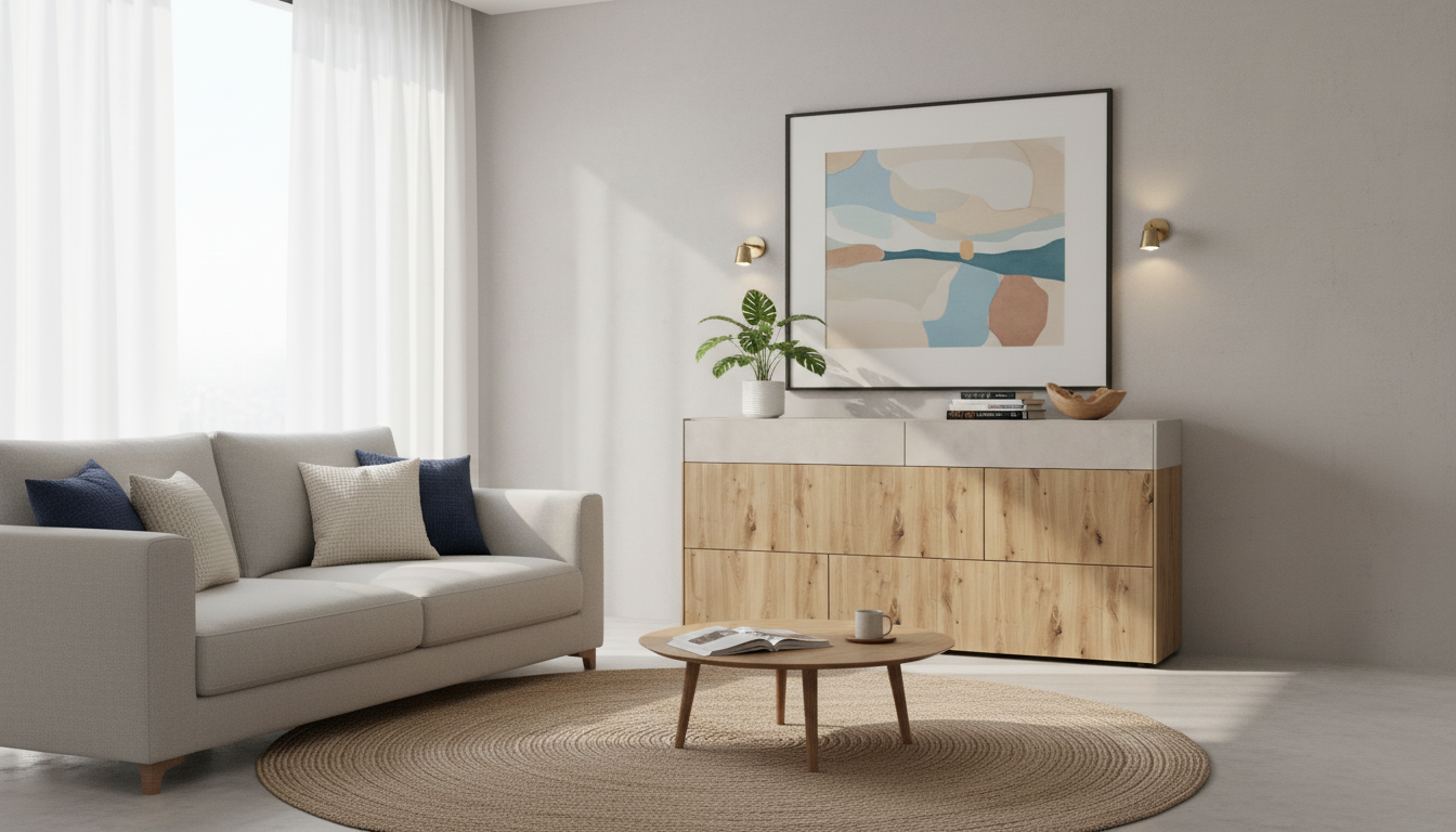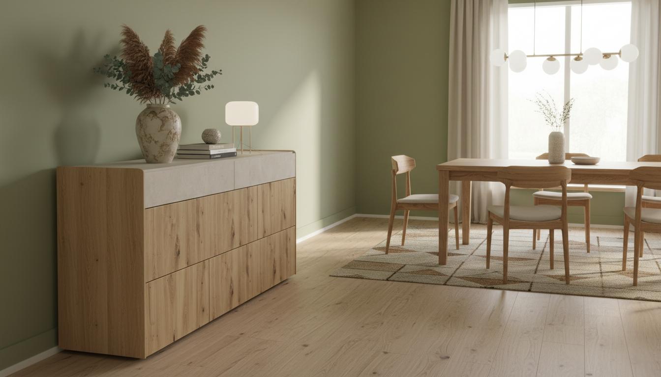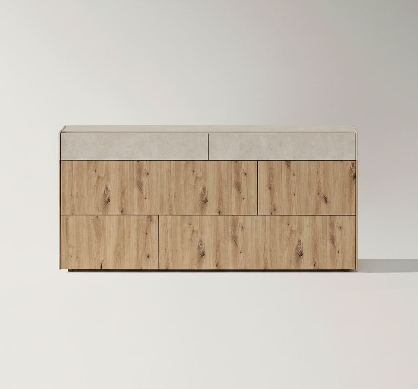 El aparador84 combina elegancia moderna con funcionalidad práctica. Fabricado en roble artesano con vetas naturales visibles y encimera en caliza de tono claro, presenta un diseño horizontal de gran capacidad con cinco cajones amplios en la base y dos superiores más estrechos, separados por la superficie superior acolchada en caliza que añade un toque sofisticado y útil como repisa o área de apoyo. Sus líneas rectas y minimalistas lo hacen ideal para salones o comedores contemporáneos, ofreciendo amplio almacenamiento oculto para vajilla, textiles o decorativos. La estructura robusta eleva el conjunto sobre patas discretas, integrándose perfectamente en espacios luminosos de Galicia. Con acabados de alta calidad, resalta la calidez de la madera roble con la frescura pétrea de la caliza, midiendo aproximadamente 182 cm de ancho por 82 cm de alto, perfecto para optimizar rincones sin sobrecargar visualmente.