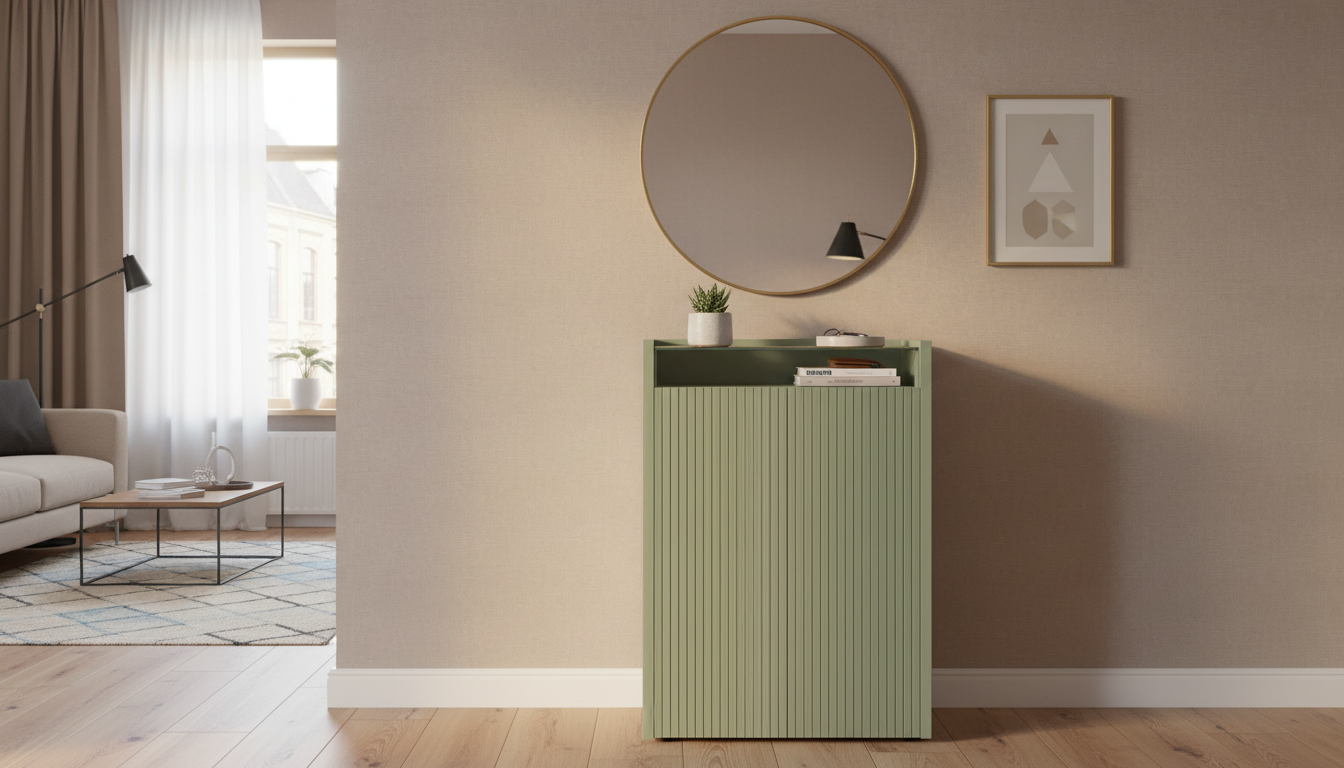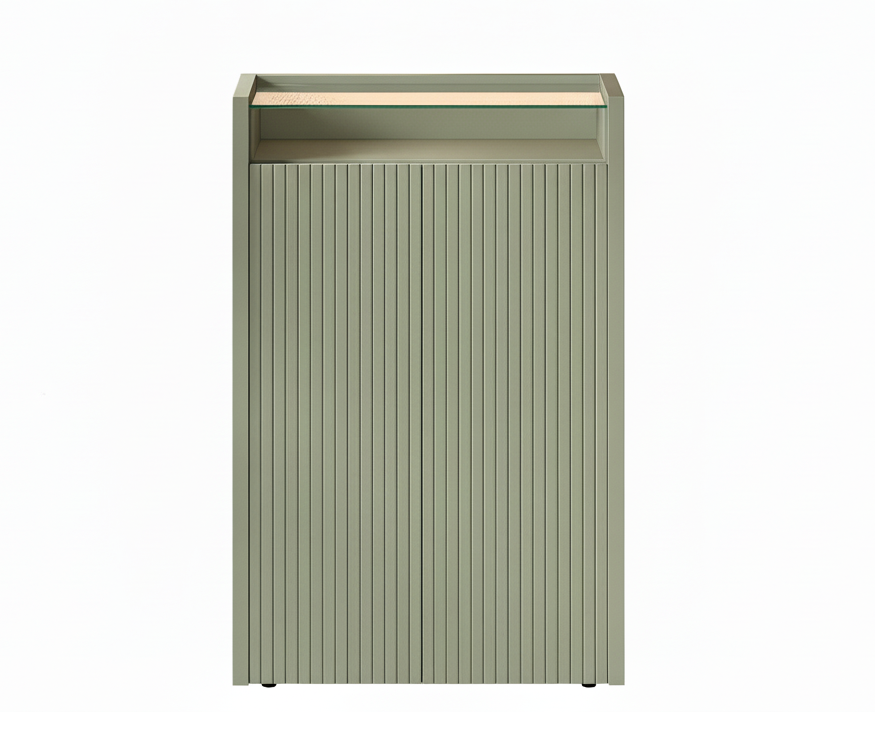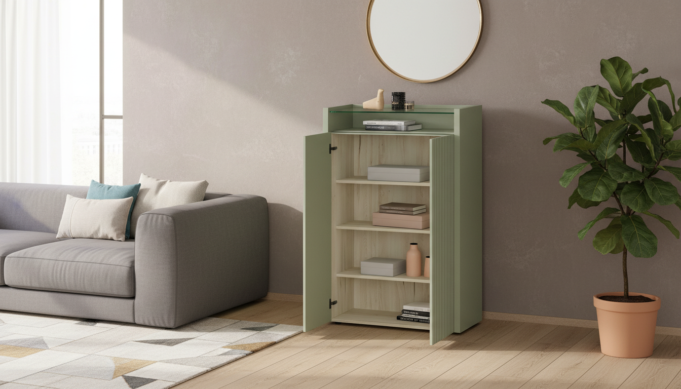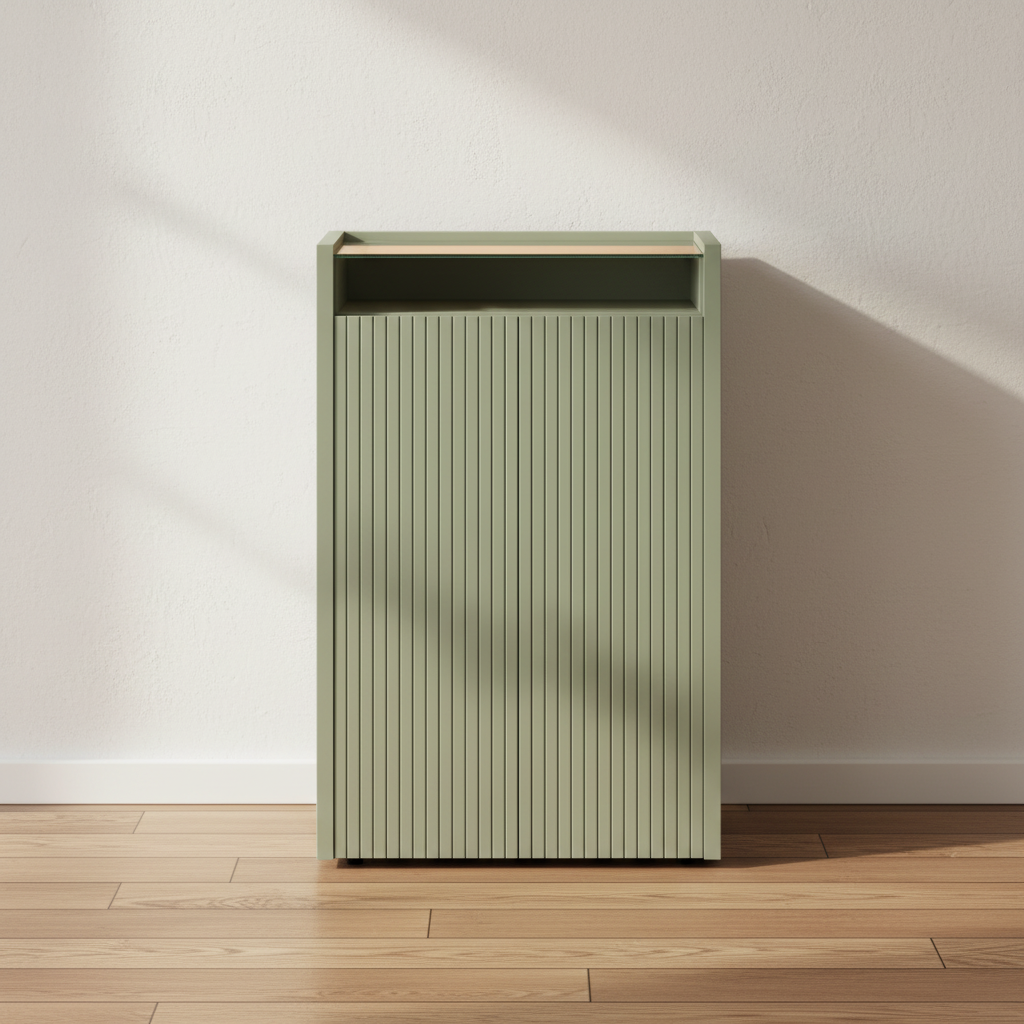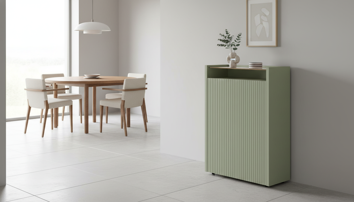 Aparador moderno en verde musgo con puertas estriadas de bambú y haya, repisa superior clara y diseño alto y funcional para almacenamiento elegante.