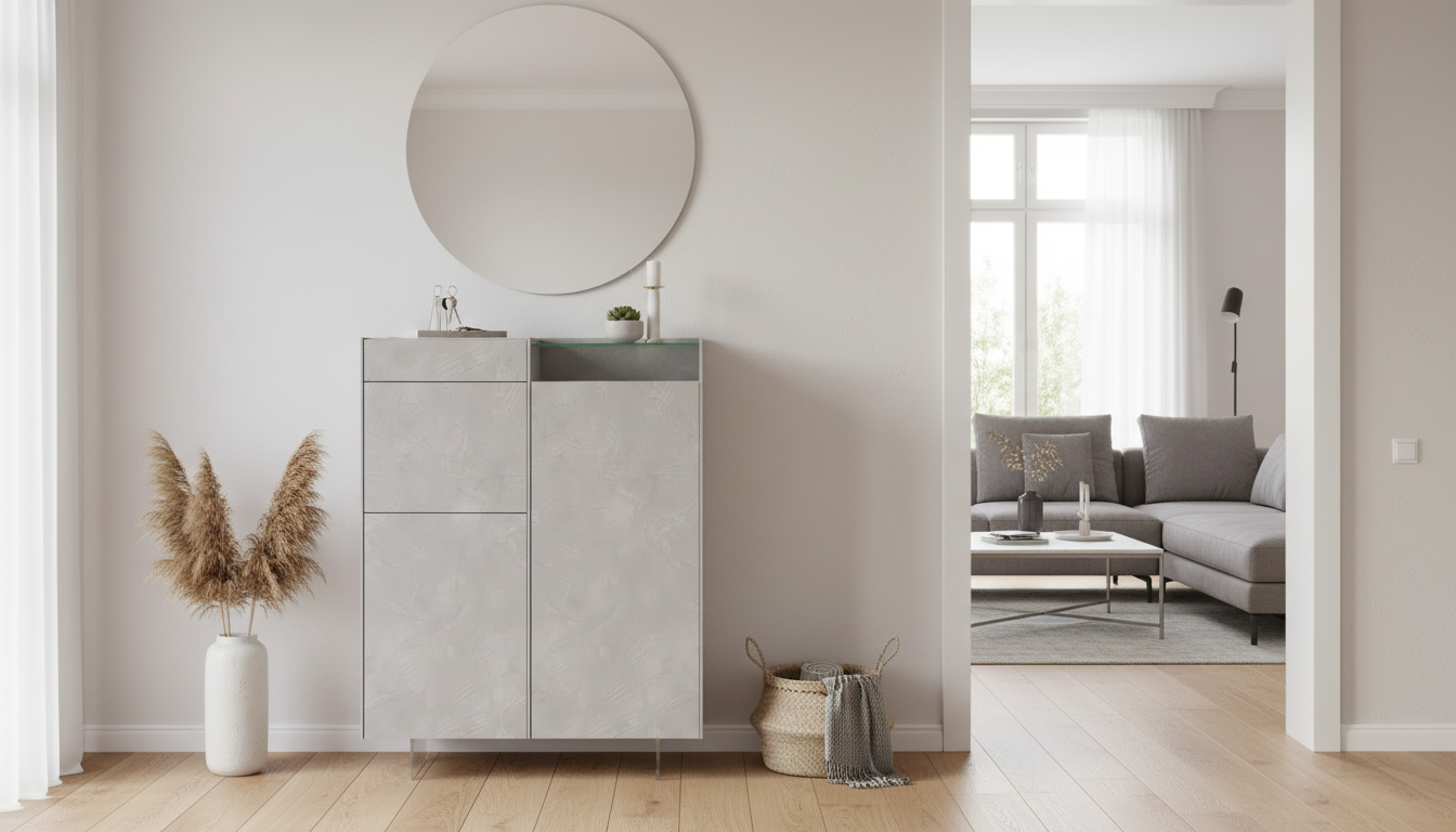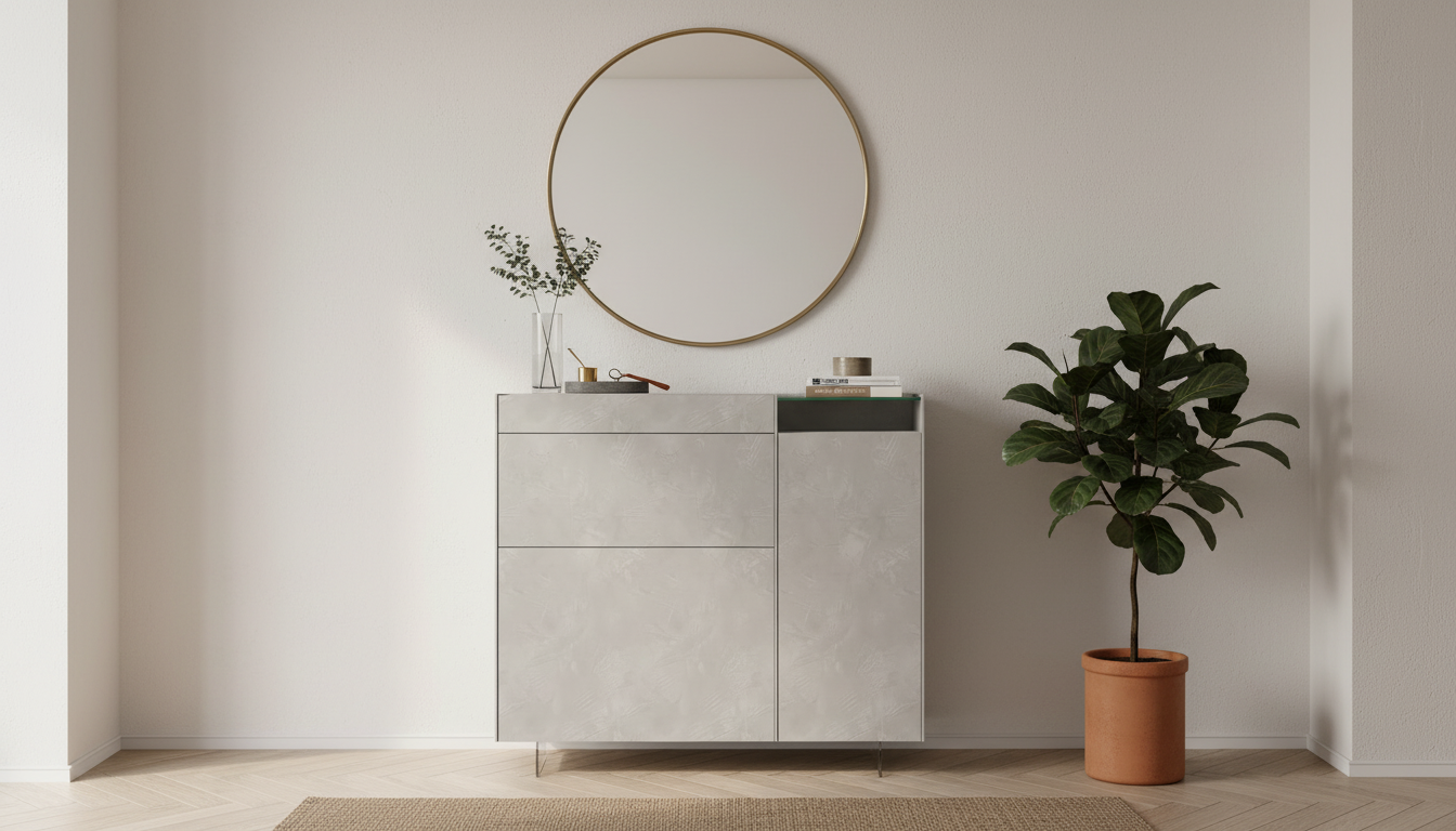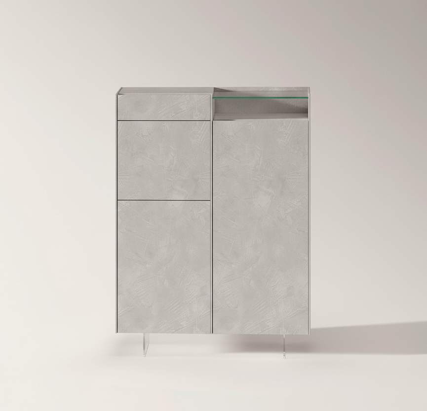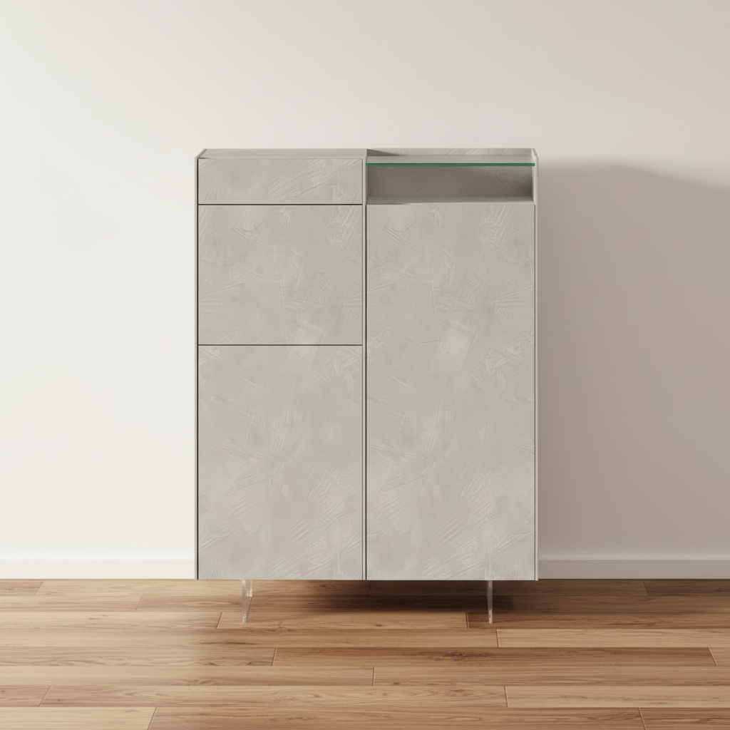 Este aparador presenta un diseño minimalista y elegante en cemento pulido gris, ideal para salones o comedores modernos. Destaca por su estructura alta y estrecha con encimera de cristal templado superior, cajones y puertas practicables que ofrecen amplio espacio de almacenamiento. Sus patas metálicas elevadas aportan ligereza visual y facilidad de limpieza, combinando robustez con un estilo contemporáneo que se integra en cualquier espacio. Este mueble de 123 cm de anchura y 160 cm de altura es perfecto para organizar vajilla, decoración o textiles, aportando sofisticación industrial sin sobrecargar el ambiente.