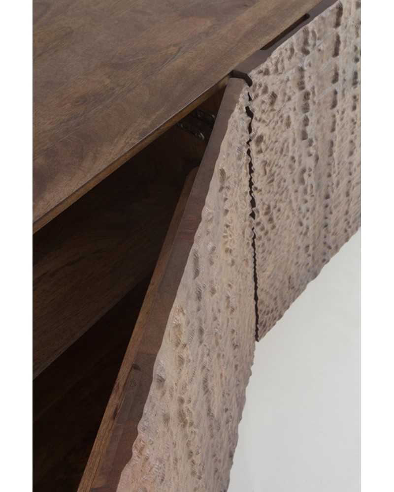 El aparador CAIMÁN es un mueble de diseño contemporáneo, realizado en madera y acabado con un frontal que simula piel de cocodrilo o caimán en relieve. Dispone de cuatro puertas lisas sin tiradores visibles, lo que refuerza su estética minimalista y elegante. Sus patas, ligeramente inclinadas y de color oscuro, aportan estabilidad y elevan la estructura, facilitando la limpieza del suelo. Es ideal como mueble auxiliar en salones o comedores modernos, combinando funcionalidad con un toque exótico y sofisticado gracias a su textura singular y acabado artesanal.