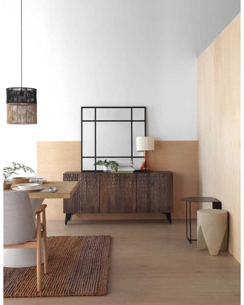 • Material principal: Madera de mango maciza, con frentes texturizados que imitan la piel de caimán. • Acabado: Las puertas presentan un efecto texturizado y mate, simulando la apariencia y tacto de la piel de caimán. • Estructura interna: Equipado con estante fijo a media altura y compartimentos independientes, útil para almacenamiento organizado. • Puertas: 3 puertas con bisagras de cierre suave de gama alta. • Patas: Metálicas, de color negro, ofreciendo un contraste visual elegante y gran estabilidad. • Color: Marrón oscuro con vetas y texturas visibles, realzando el relieve caimán. • Uso: Ideal como aparador en salón, comedor o recibidor; soporta peso moderado sobre su superficie y es apto para organizar vajilla, libros u objetos decorativos. • Limpiar con paño suave y ligeramente húmedo. • Evitar productos abrasivos o exposición directa al sol para conservar el color y la textura. • Recomendable usar protectores en las patas para evitar roces en el suelo.