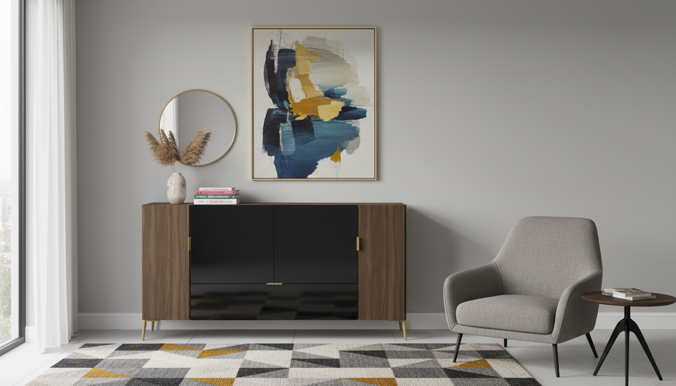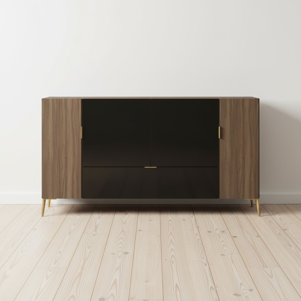 • Material principal: madera de nogal con acabados en negro mate. • Puertas: dos biombos centrales en negro con tiradores dorados. • Cajón: uno central coordinado en negro mate. • Patas: delgadas de metal en acabado dorado, elevan 10 cm del suelo. • Medidas: 150 cm ancho x 70 cm alto x 40 cm fondo. • Capacidad: interior espacioso para vajilla, ropa o decoración. • Estilo: contemporáneo minimalista con contraste bicolor.