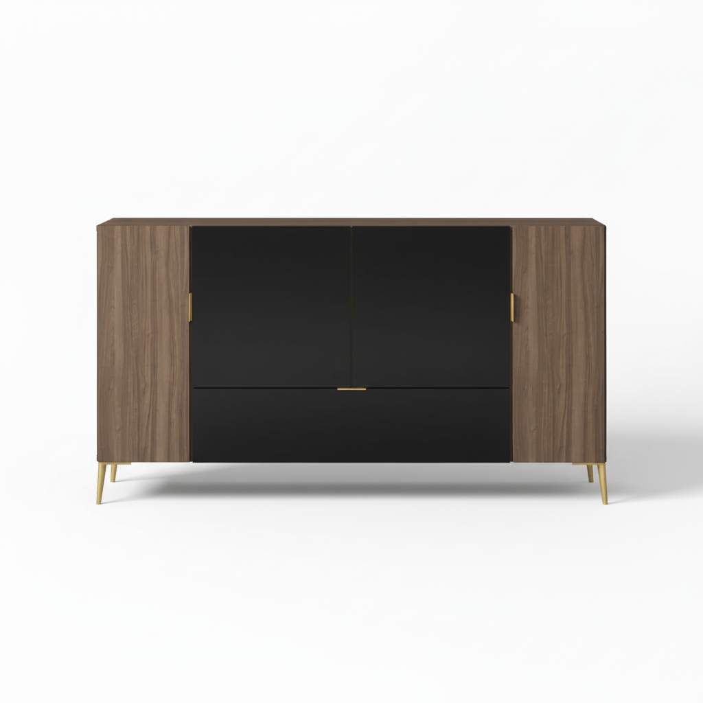 Aparador moderno en madera nogal y negro con patas doradas, diseño elegante y funcional para el hogar.