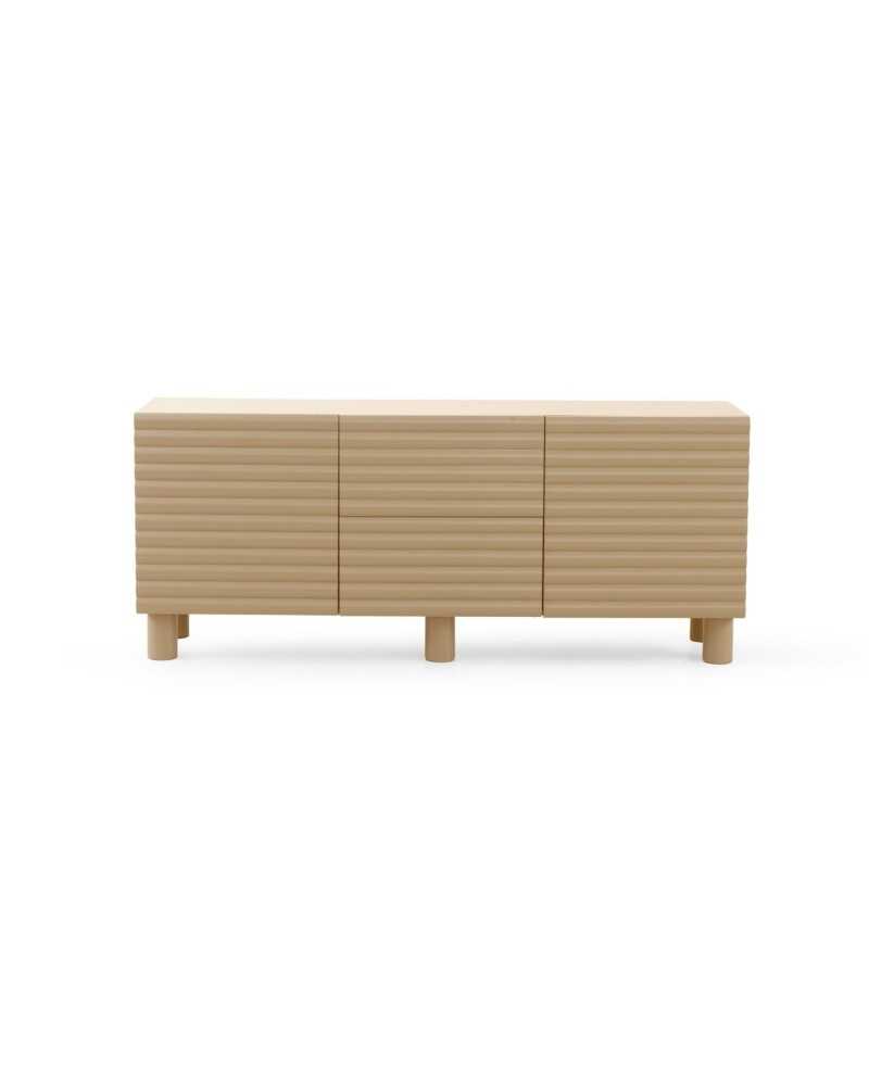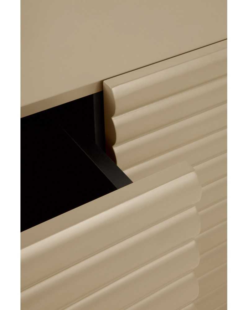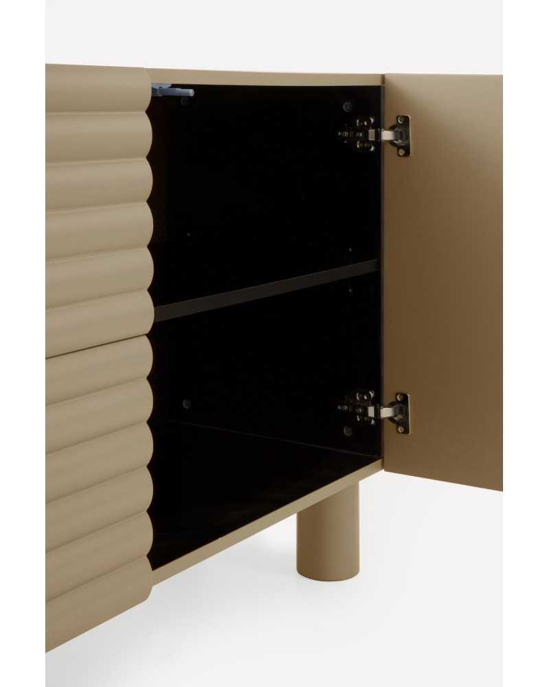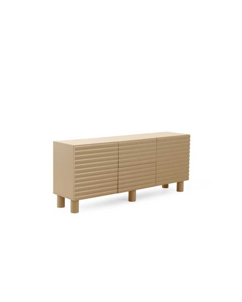Aparador fabricado en MDF, acabado en color beige arena, de líneas rectas y aspecto contemporáneo. Destaca su diseño frontal con relieves lineales horizontales, que aportan un efecto visual dinámico y elegante a la pieza. Dispone de tres puertas abatibles sin tiradores visibles, integrando un sistema de apertura push o similar para mantener una estética minimalista. Apoya sobre cinco patas cilíndricas sólidas, de la misma tonalidad que el cuerpo, proporcionando estabilidad y uniformidad cromática. Su interior ofrece un espacio amplio y versátil para almacenamiento, ideal para salones, comedores o recibidores modernos.