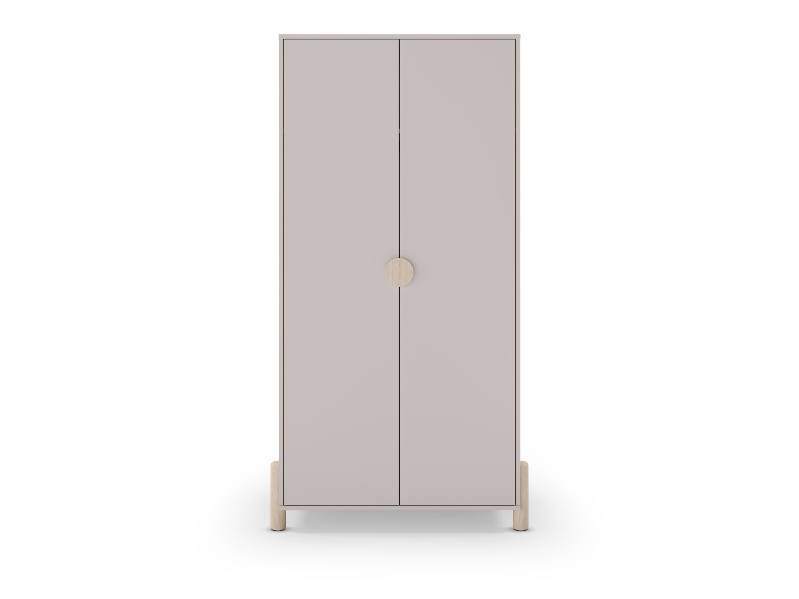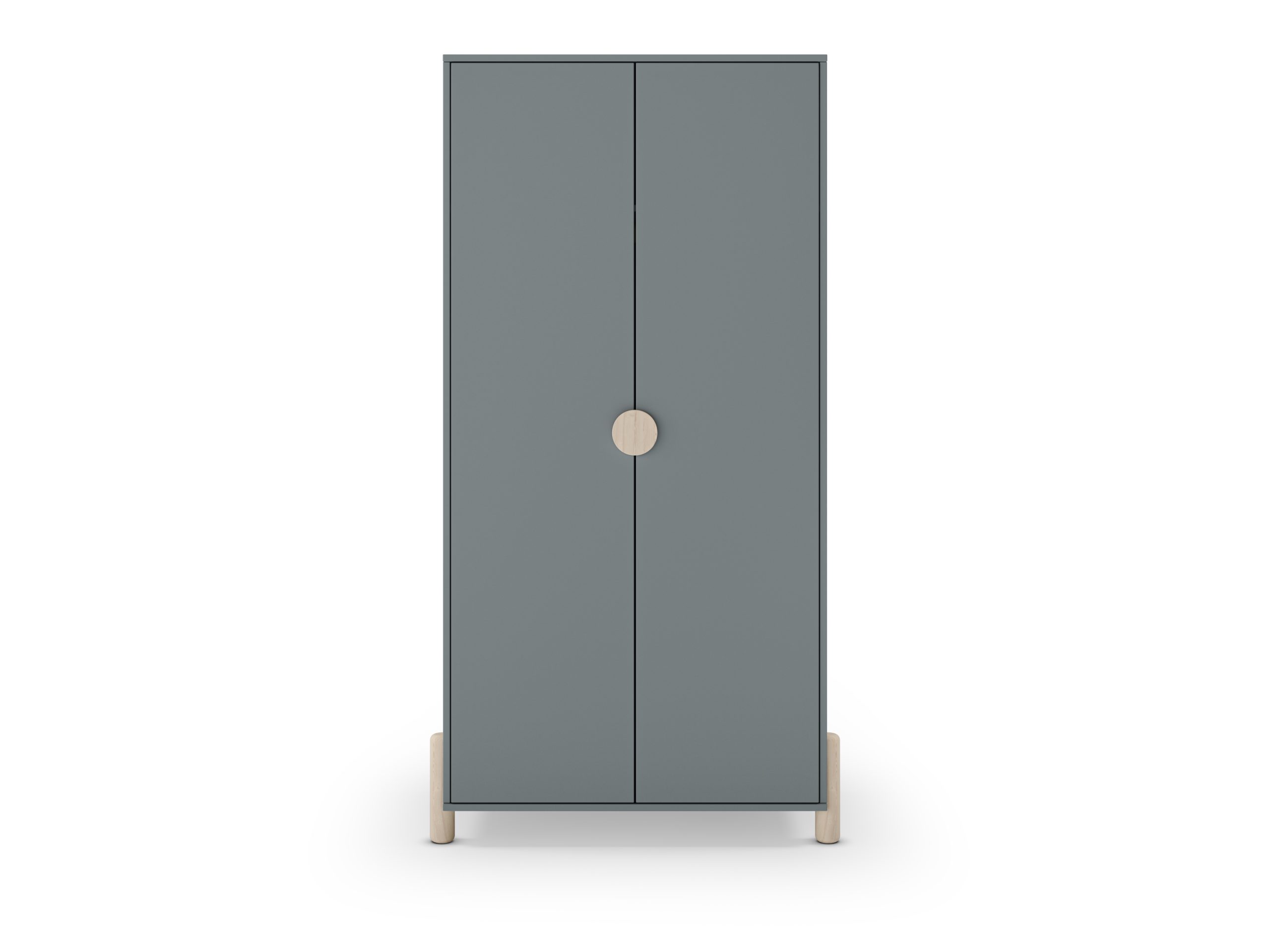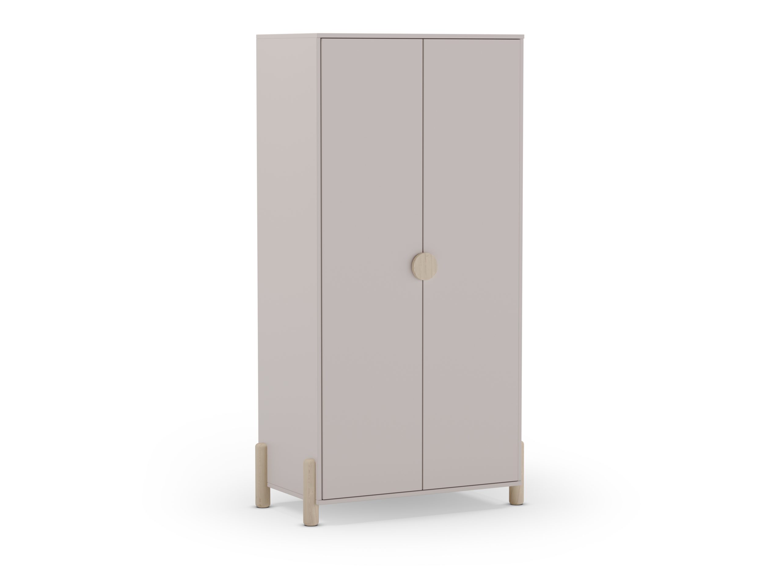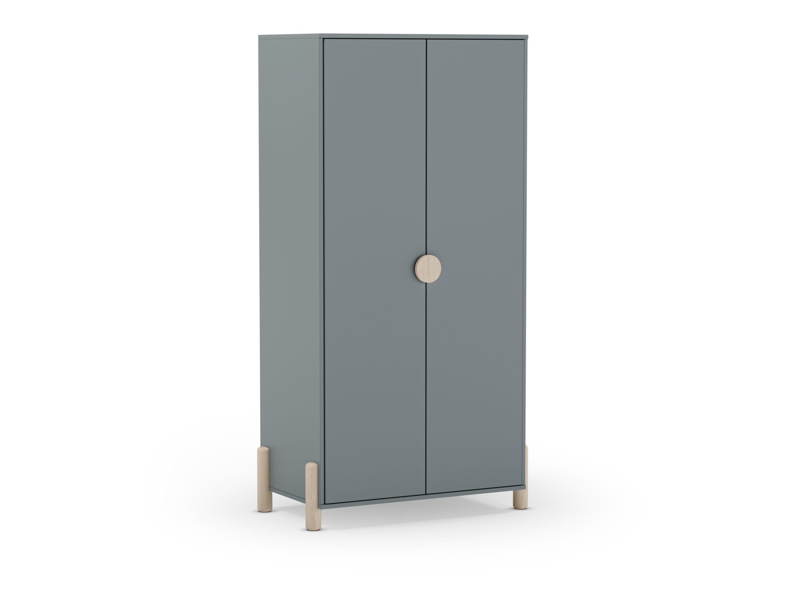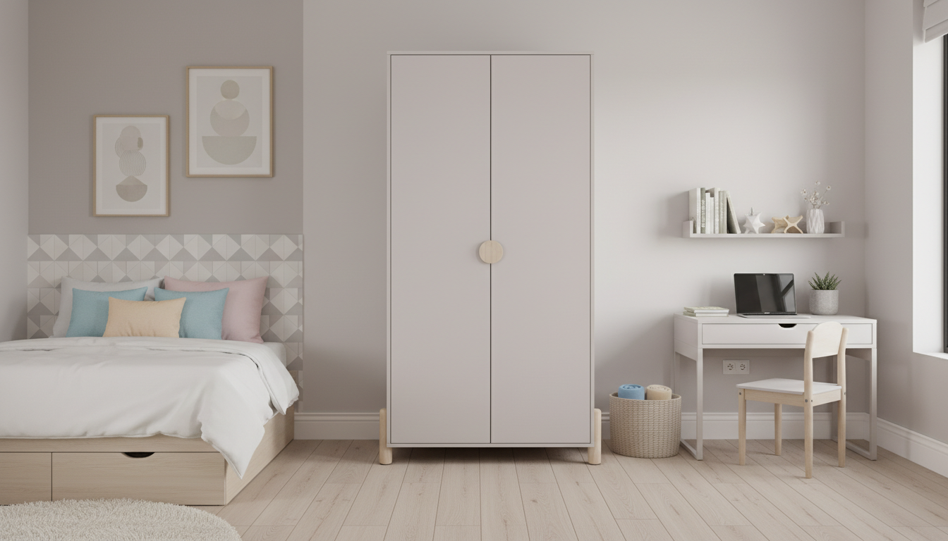 Armario de dos puertas con tirador discreto y patas elevadas. Ofrece espacio interior para colgar y estanterías. Estilo nórdico funcional para dormitorios juveniles.