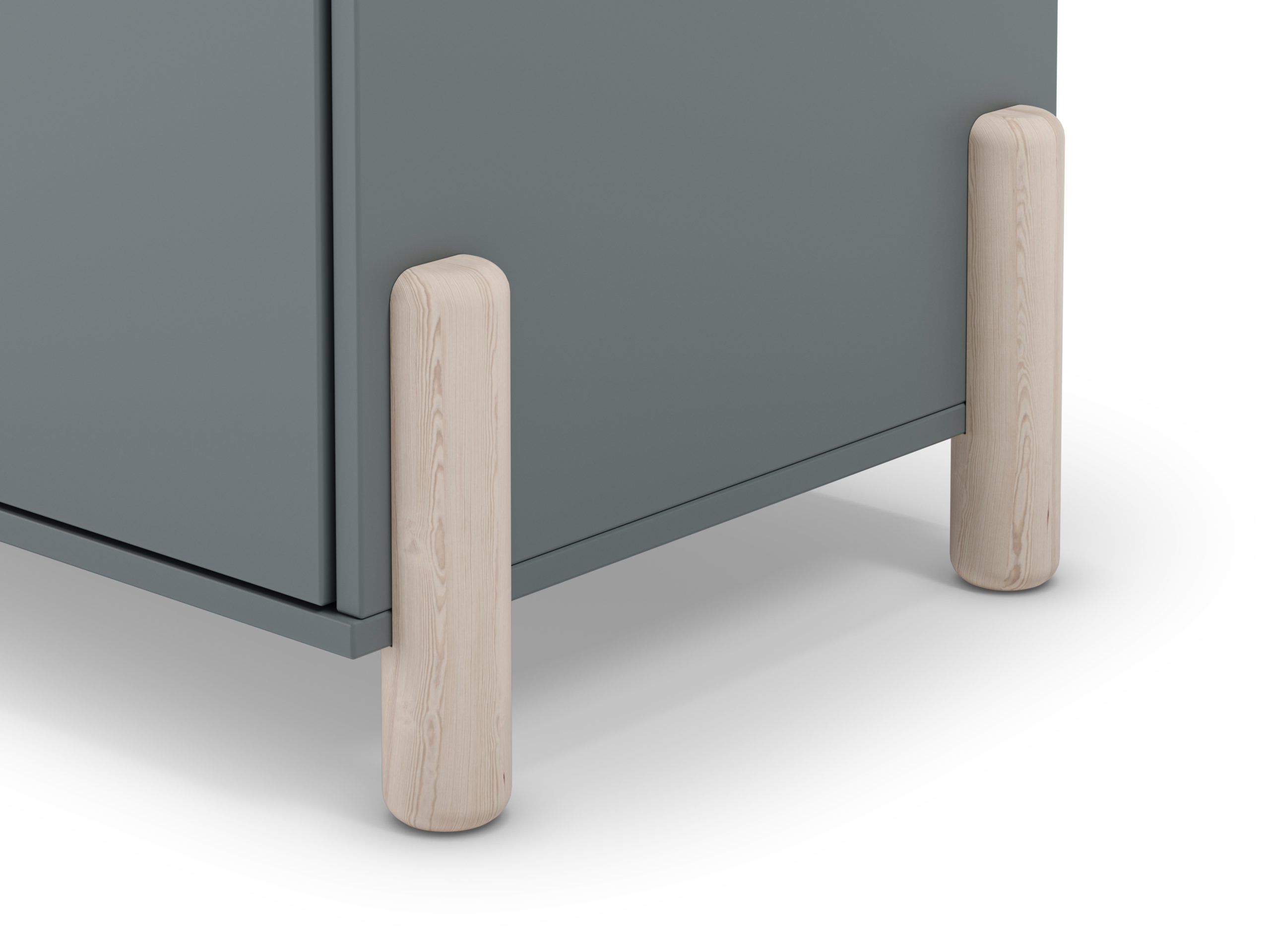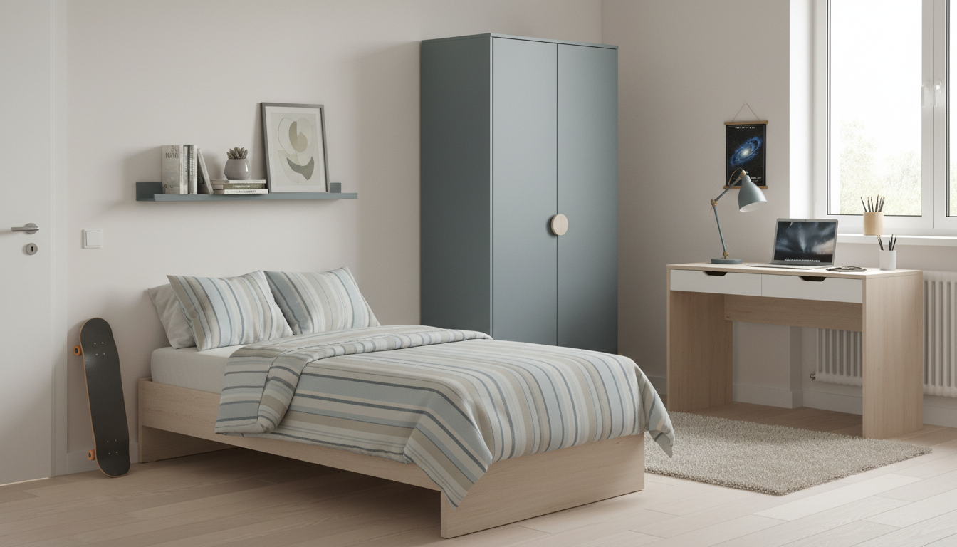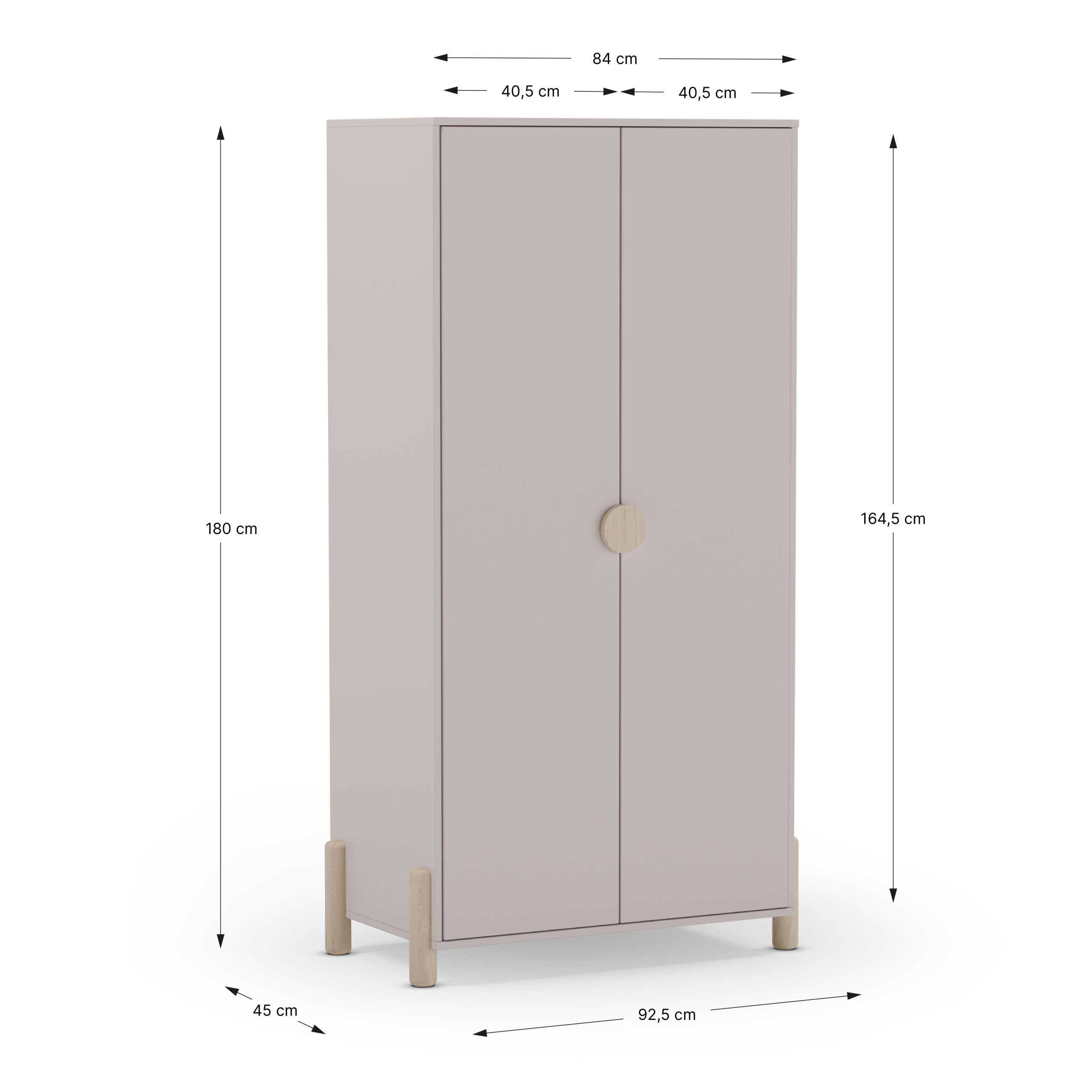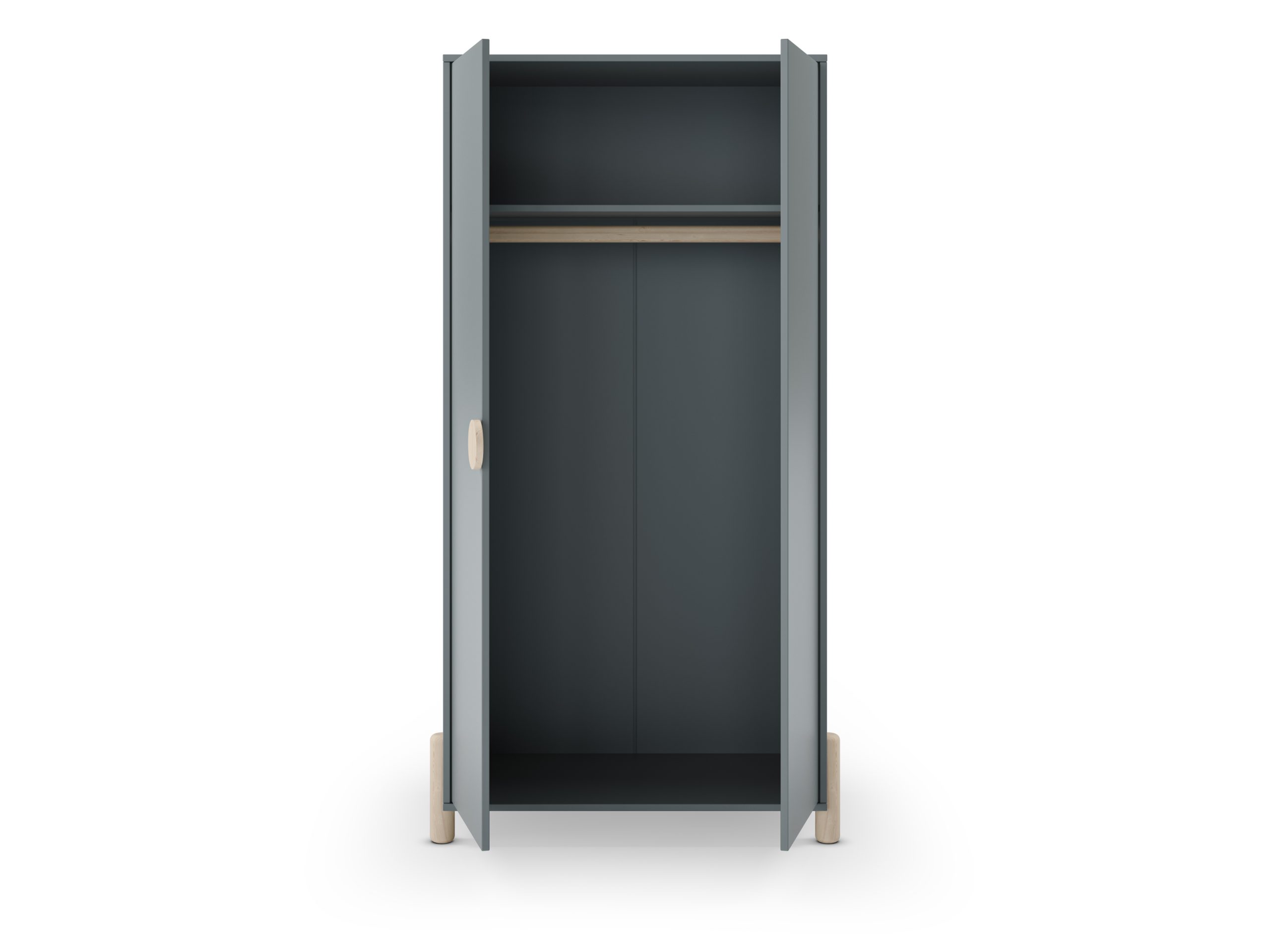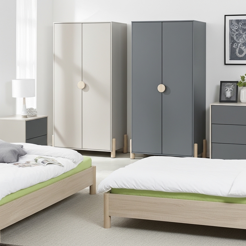 Armario de dos puertas con tirador discreto y patas elevadas. Ofrece espacio interior para colgar y estanterías. Estilo nórdico funcional para dormitorios juveniles.