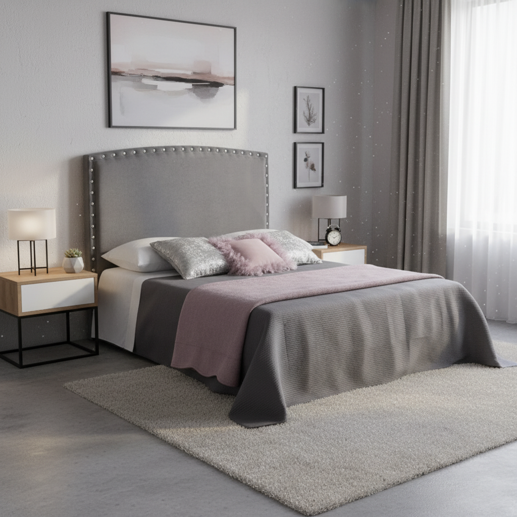 Este cabecero tapizado con remate de tachuelas aporta un aire elegante y atemporal al dormitorio, combinando una línea ligeramente curvada en la parte superior con un diseño liso muy fácil de integrar en cualquier estilo decorativo. Su estructura acolchada ofrece un apoyo cómodo para leer o ver la televisión en la cama, a la vez que protege la pared y evita roces del colchón, mejorando la sensación de confort general en la habitación. Gracias a su diseño recto y a su grosor uniforme, se adapta visualmente a diferentes tamaños de cama, creando un conjunto equilibrado y acogedor sin recargar el espacio.