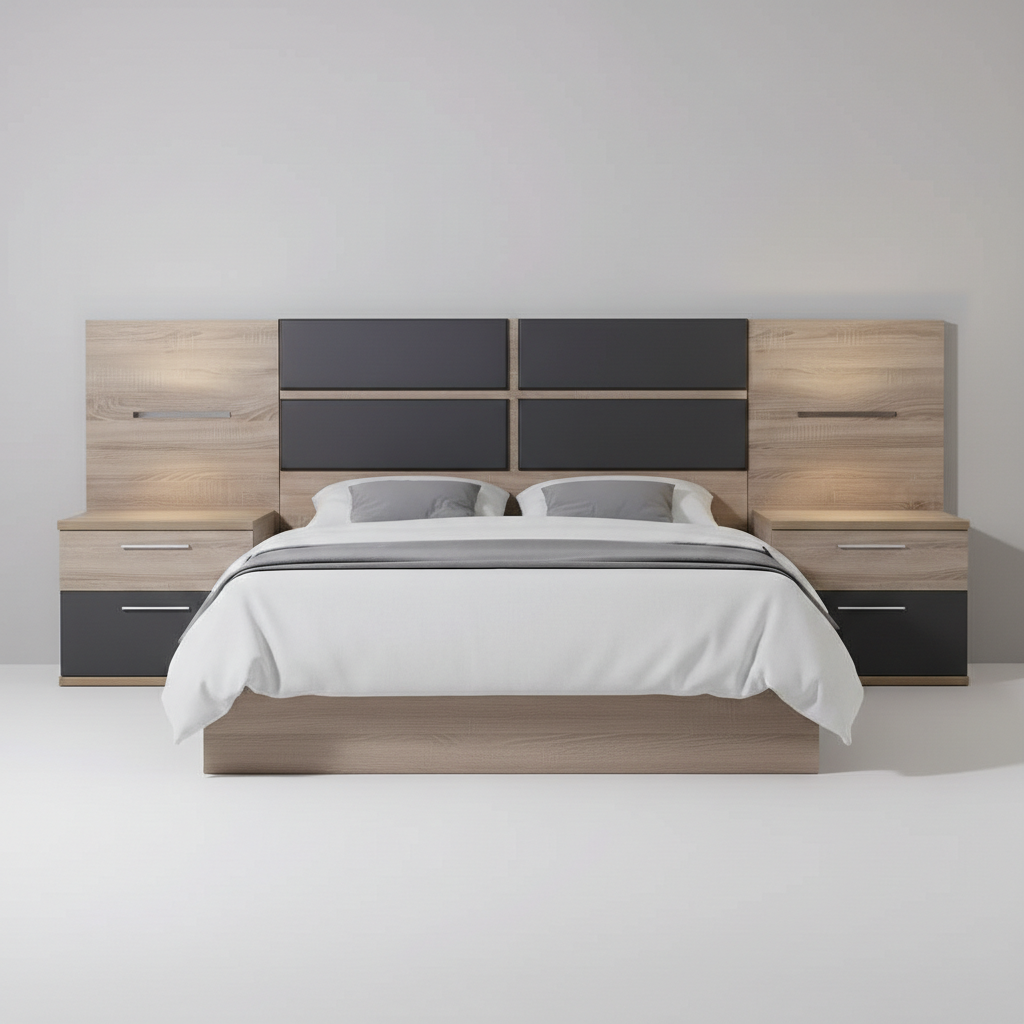 Este cabecero destaca por su estructura de madera clara con vetas naturales que aportan calidez y elegancia al dormitorio. Los cuatro paneles centrales en tono gris mate crean un contraste sofisticado, mientras que los laterales altos ofrecen protección y estabilidad. Incluye tiradores metálicos discretos en los módulos inferiores, sugiriendo funcionalidad con posibles espacios de almacenamiento.
