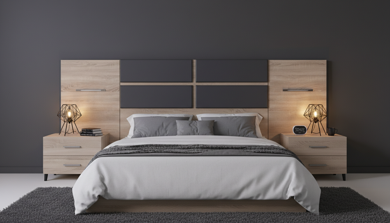 Cabecero moderno de madera con paneles grises centrales y tiradores metálicos para un dormitorio elegante y funcional.