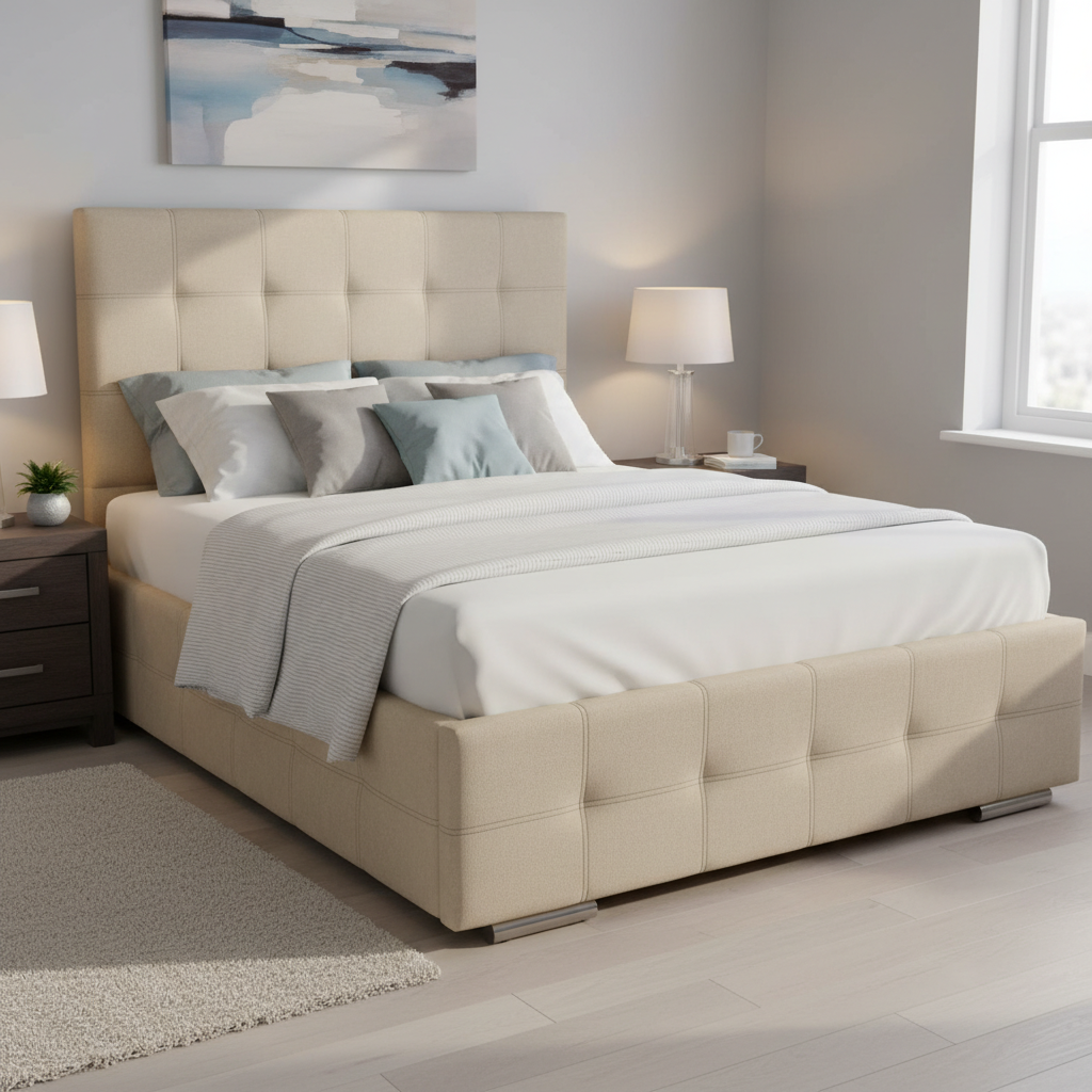 Cabecero capitoné tapizado con estructura de cama integrada, acolchado suave y botones decorativos para un dormitorio elegante y confortable.