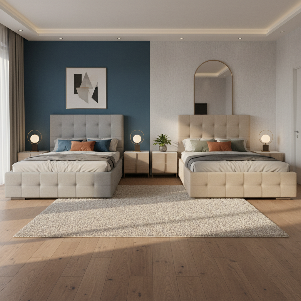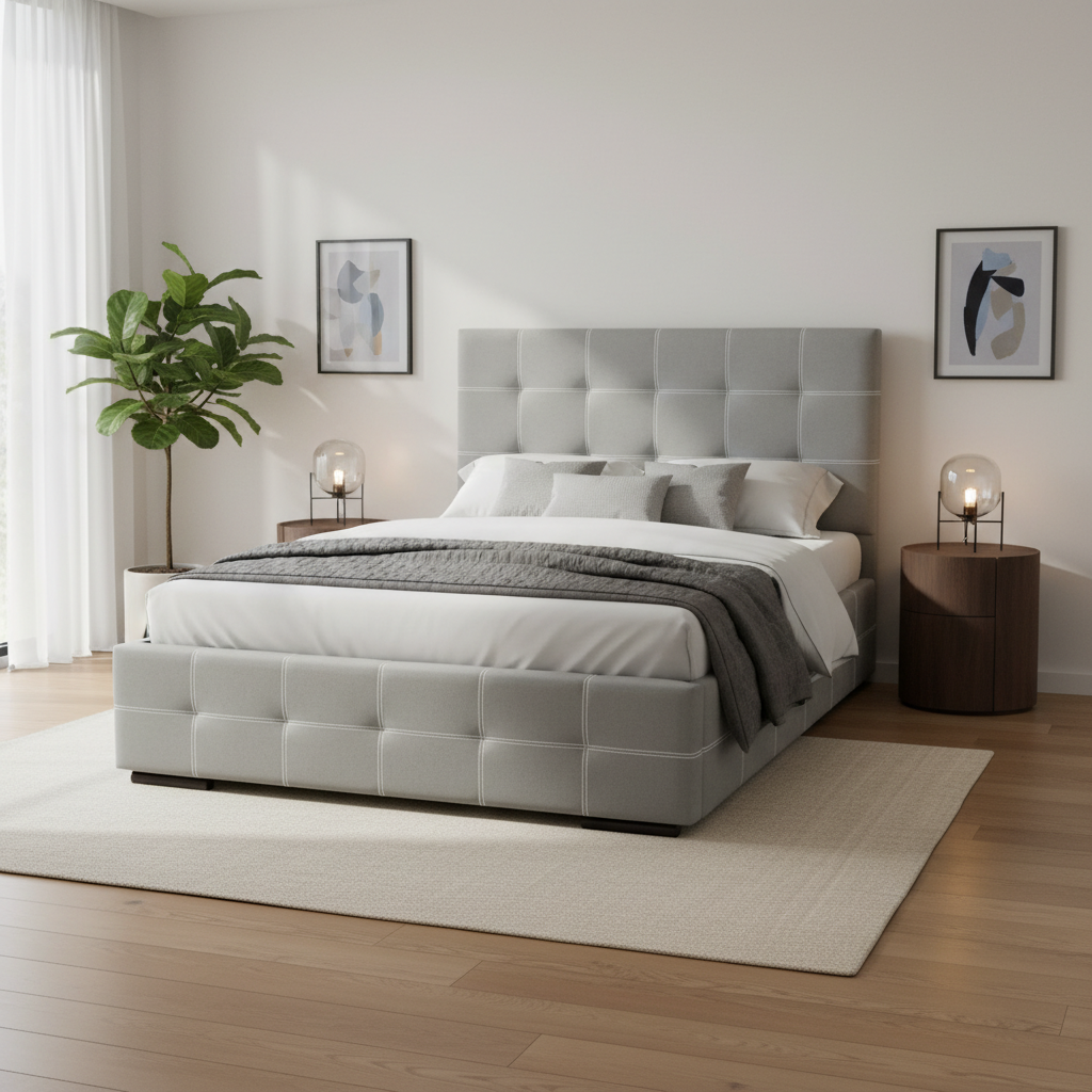 Este cabecero presenta un acabado capitoné con paneles acolchados y botones decorativos que aportan un toque clásico y sofisticado al dormitorio. La estructura incluye laterales y base tapizados que forman un conjunto completo con la cama, protegiendo la pared y facilitando el apoyo de almohadas y mantas. Su diseño acolchado proporciona comodidad extra al recostarse, elevando el estilo general de la habitación.