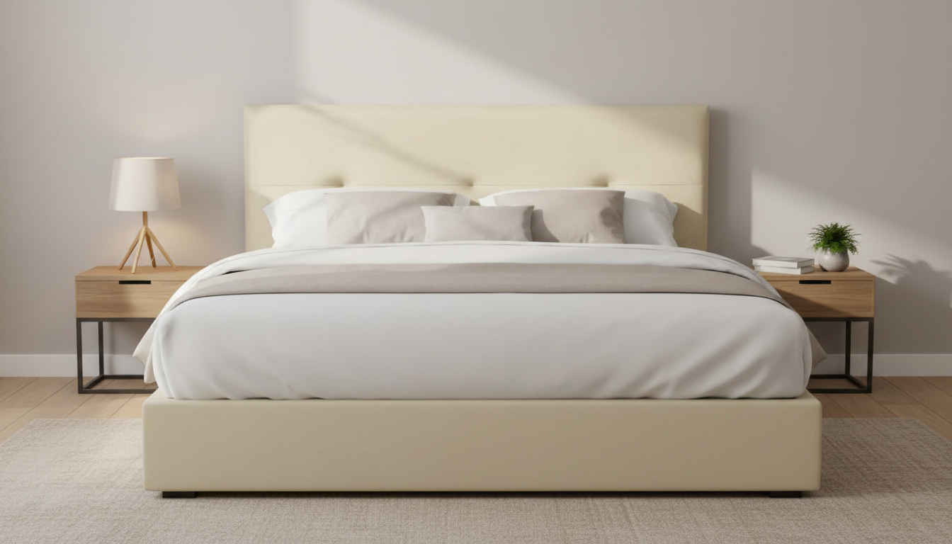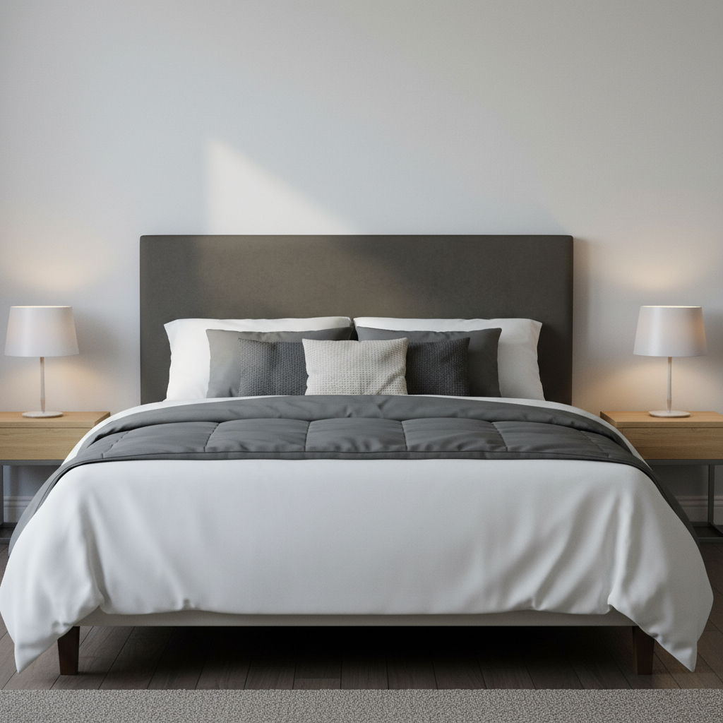 El cabecero tapizado presenta un diseño minimalista y rectangular que aporta elegancia y comodidad al dormitorio. Su acabado liso y suave invita a apoyarse para leer o descansar, integrándose perfectamente en estilos modernos o contemporáneos. Este elemento transforma el espacio en un rincón acogedor y sofisticado, con líneas limpias que realzan la decoración sin sobrecargarla.