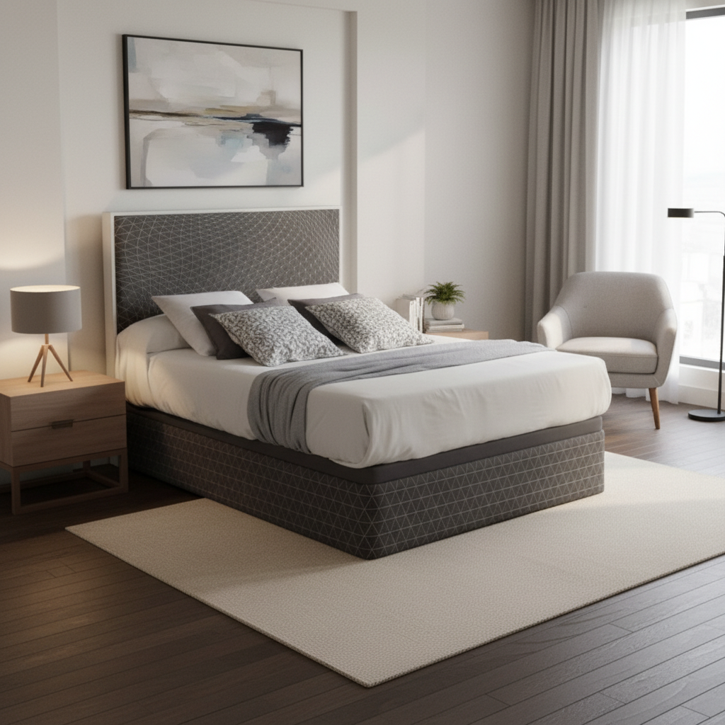 Este cabecero destaca por su tapizado en tela con un relieve geométrico tridimensional que genera profundidad visual y un estilo minimalista actual. Combina elegancia y funcionalidad, adaptándose a diversos estilos decorativos gracias a su patrón abstracto en tonos neutros y bordes nítidos. Proporciona un soporte suave y ergonómico, elevando la estética del conjunto de la cama.
