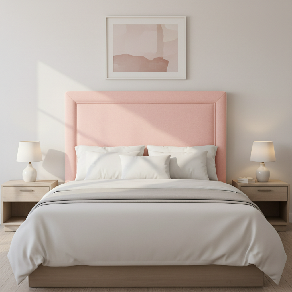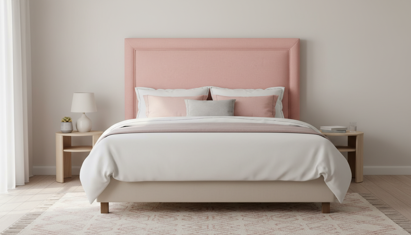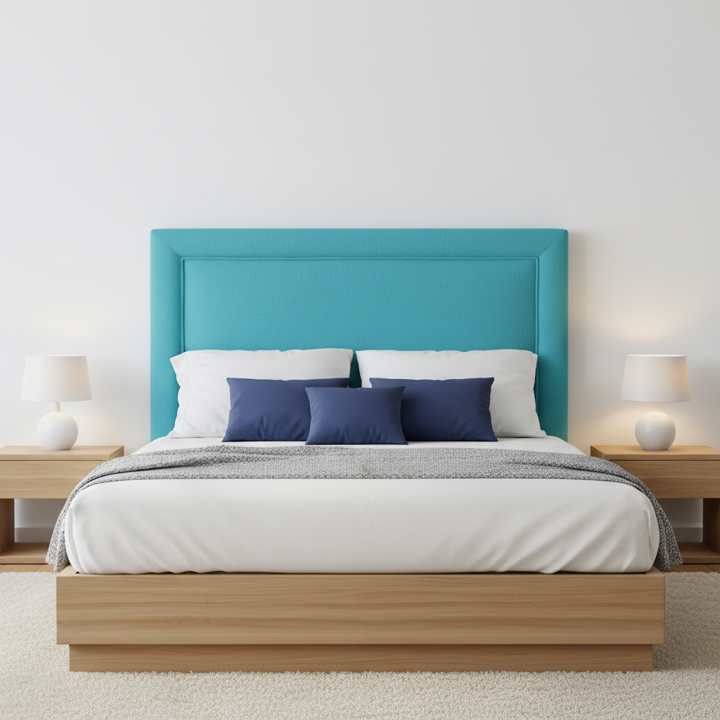 El cabecero tapizado presenta un diseño rectangular con un marco elevado y prominente que recorre todo su contorno, aportando un aspecto moderno y estructurado ideal para dormitorios contemporáneos. Su superficie acolchada ofrece un tacto suave y confortable, perfecto para apoyar la espalda durante la lectura o el descanso, mientras que el tapizado uniforme realza la elegancia minimalista del conjunto. Este modelo se integra fácilmente en espacios variados, desde estilos nórdicos hasta industriales, elevando la estética general de la habitación con su silueta definida y su acabado pulido que sugiere calidad y durabilidad en el uso diario.