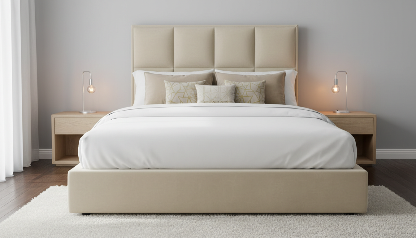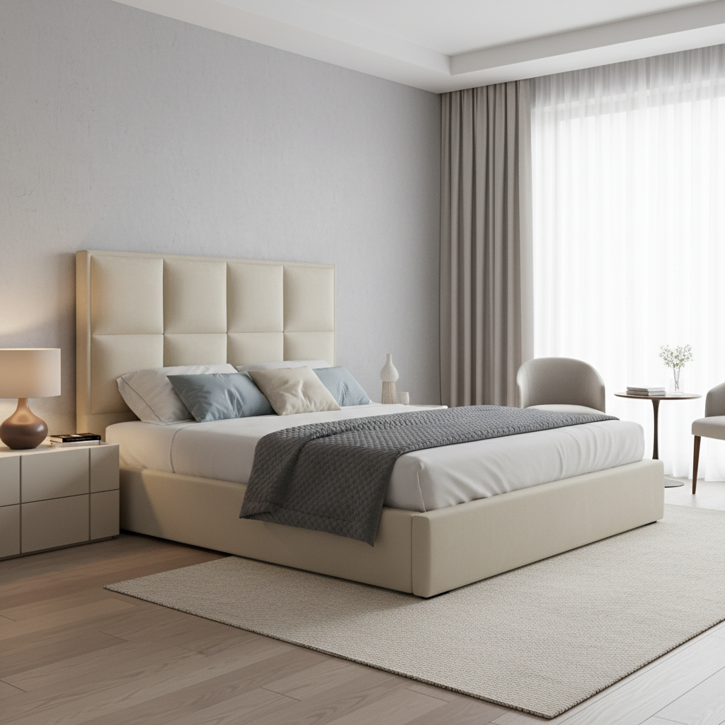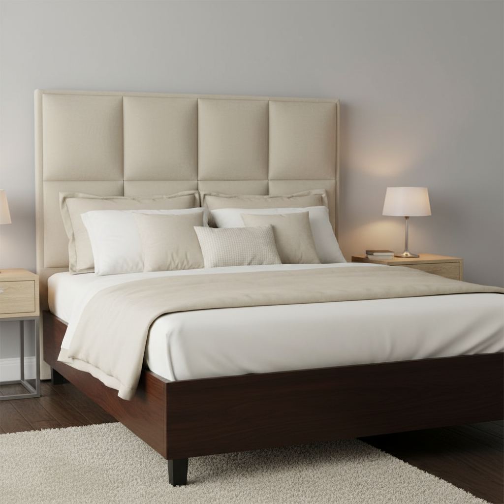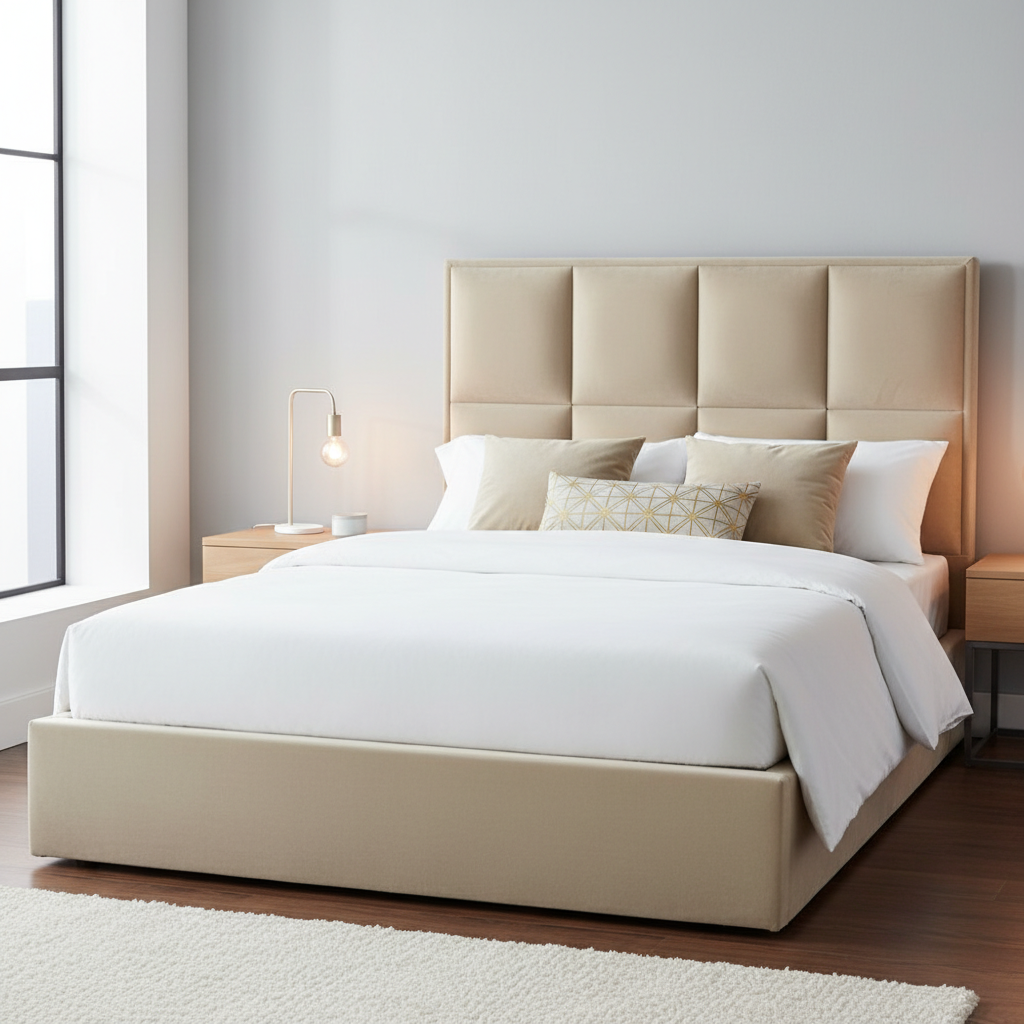 Cabecero tapizado con paneles acolchados en cuadrícula, diseño moderno y base sólida para máximo confort.