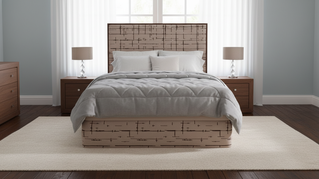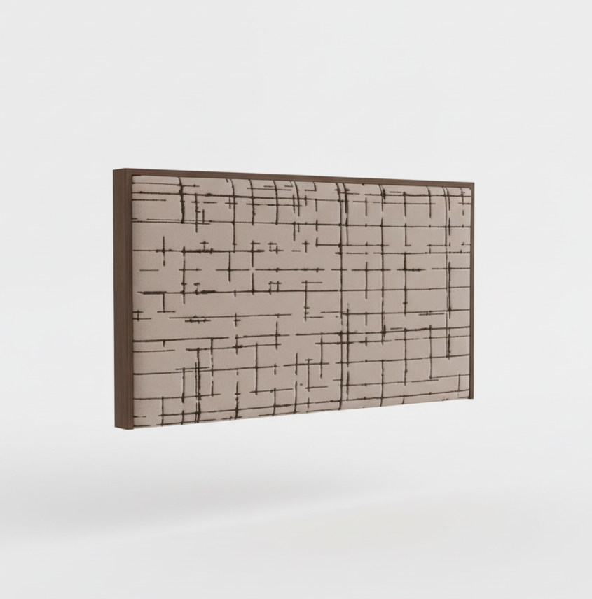 Este cabecero tapizado incorpora un entramado de líneas finas y cruzadas que generan un efecto visual dinámico y sofisticado, aportando textura y profundidad al espacio. Su estructura acolchada proporciona un respaldo suave perfecto para momentos de relax, como leer o ver televisión, mientras protege la pared de roces. El acabado en tela neutra lo hace versátil para diversos estilos decorativos, desde minimalistas hasta más acogedores.