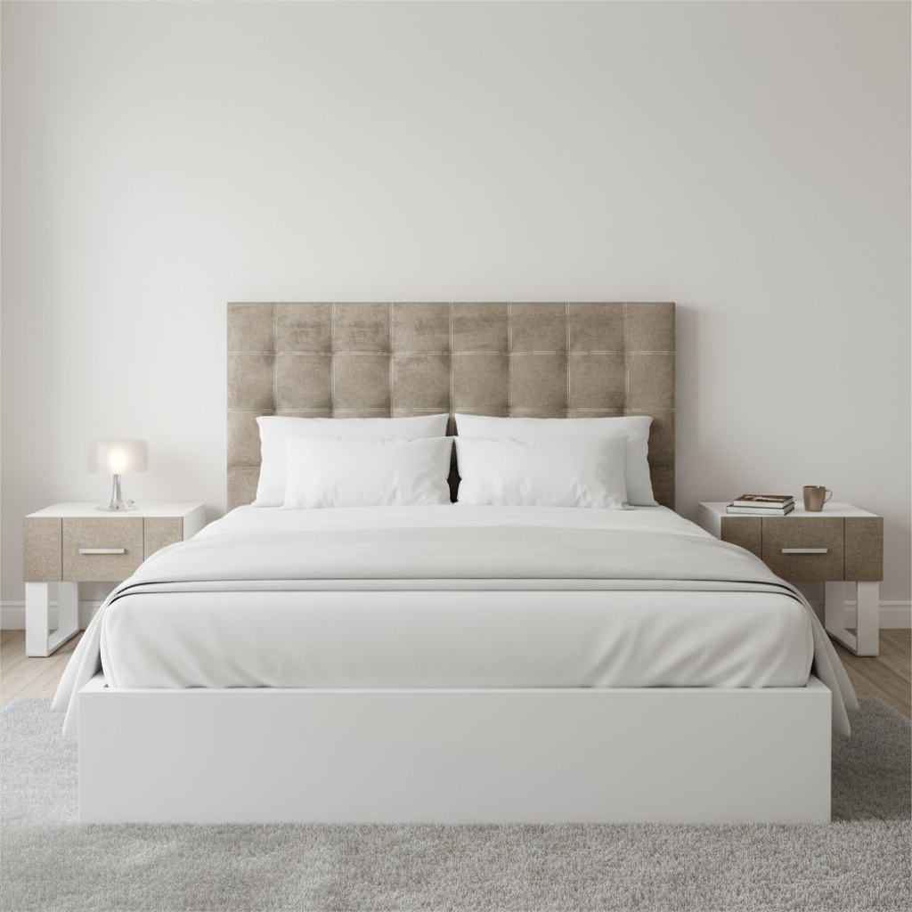 El cabecero presenta un diseño elegante y sofisticado con tapizado capitoné en la parte superior, caracterizado por costuras en rombos que aportan un toque clásico y lujoso al dormitorio. Dispone de un panel inferior continuo que proporciona estabilidad y protección a la pared, ideal para crear un ambiente acogedor y moderno. Fabricado con materiales resistentes, combina comodidad para recostarse con una estética versátil que se adapta a diversos estilos decorativos, desde vintage hasta contemporáneo, elevando el conjunto de la cama a un nivel premium.