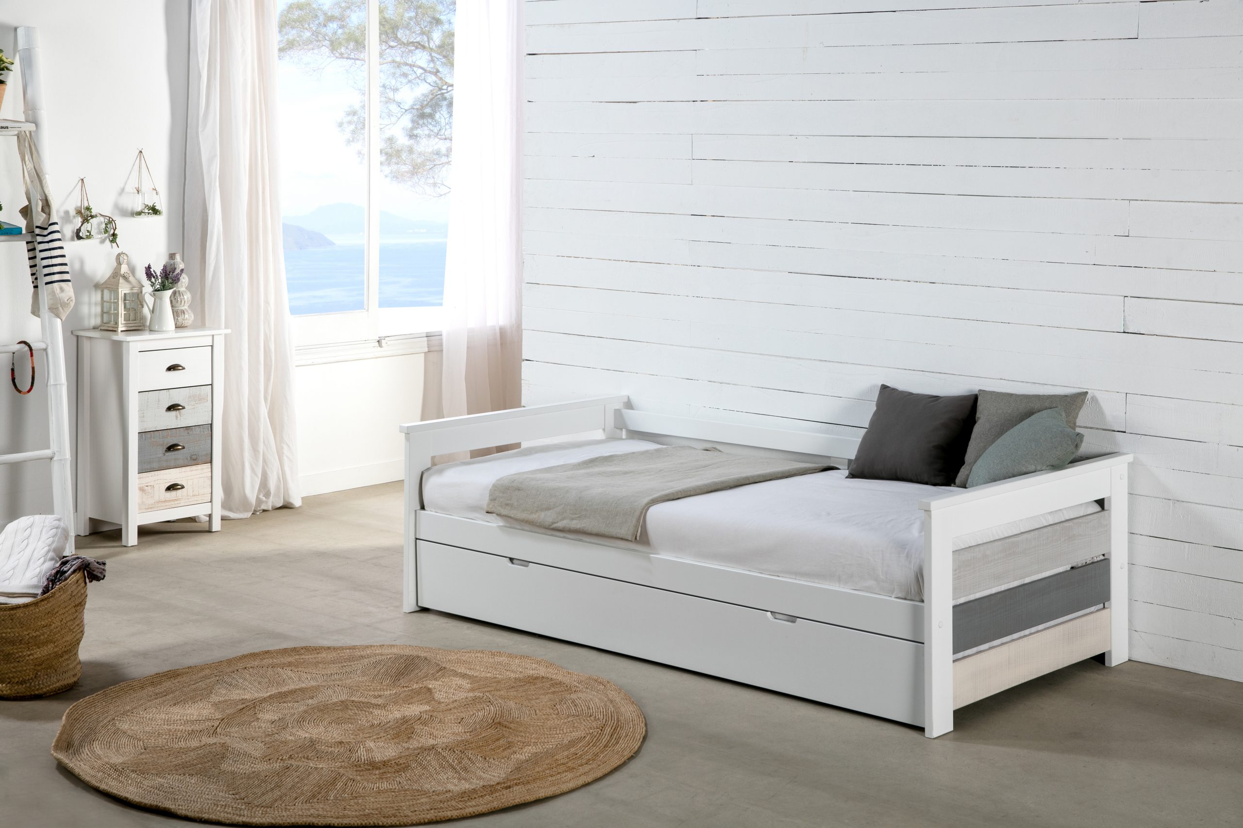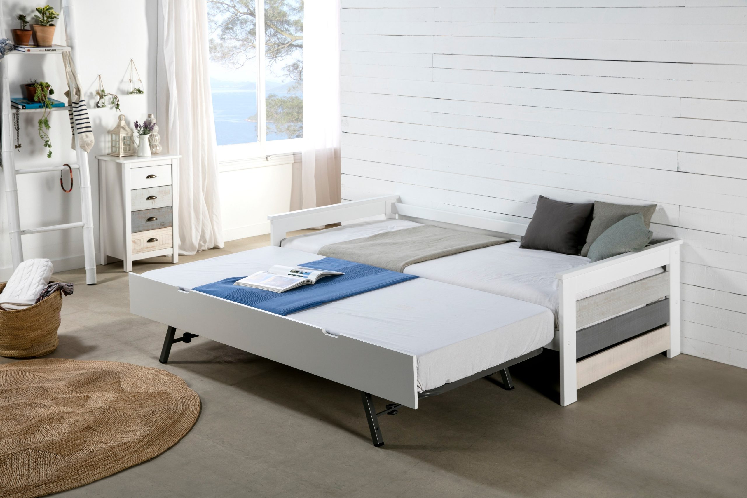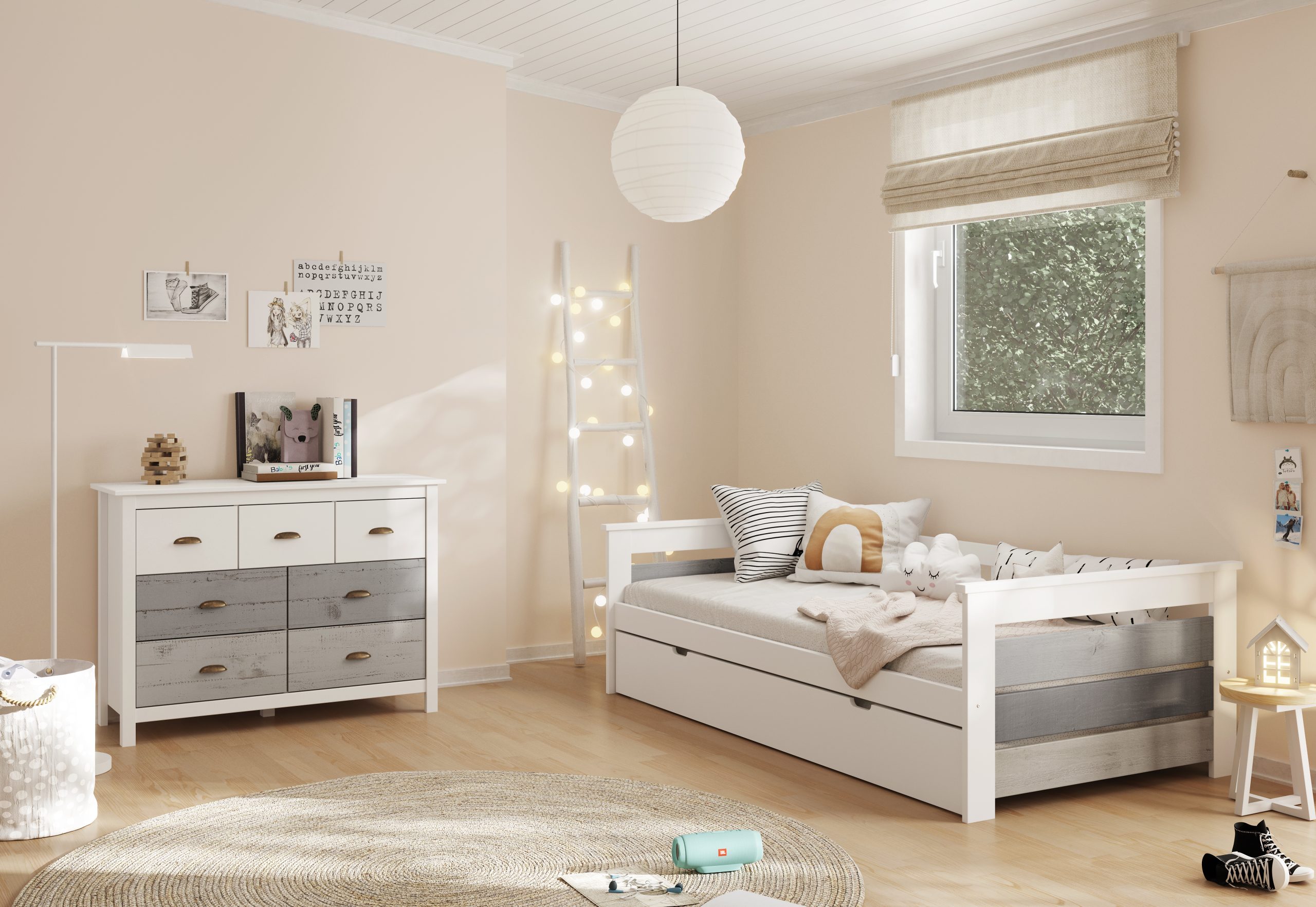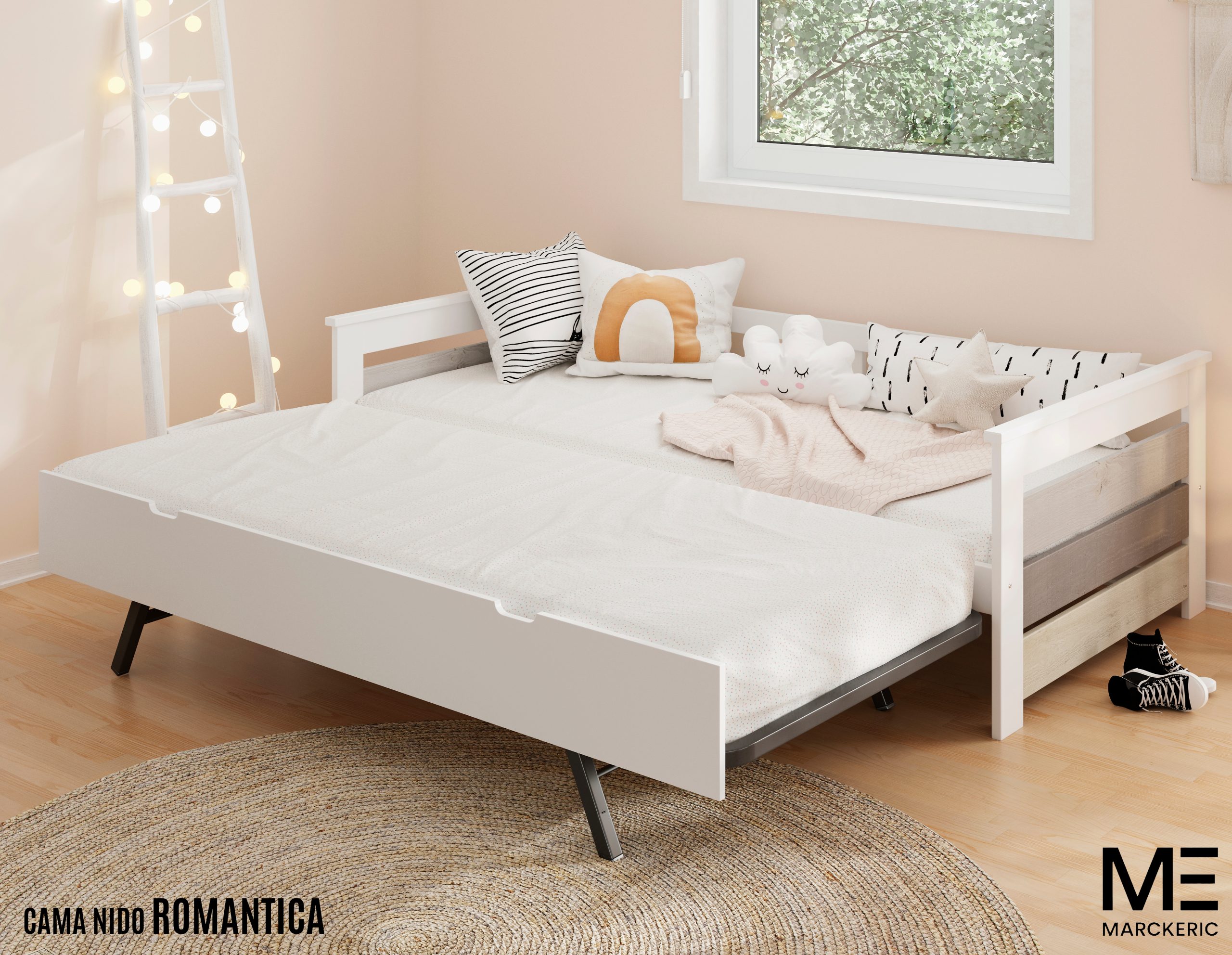 Esta cama destaca por su estructura robusta con laterales protectores que aseguran seguridad durante el sueño. Incluye cajones inferiores espaciosos para guardar ropa de cama, juguetes o accesorios, manteniendo la habitación ordenada. El somier superior soporta colchones estándar, mientras que la colchoneta inferior proporciona un mullido extra. Fabricada con materiales resistentes como DM y pino, ofrece un acabado natural que aporta calidez al dormitorio infantil. Su elevación moderada facilita el acceso a niños en edad preescolar, fomentando autonomía sin riesgos. Los listones del somier garantizan ventilación óptima para un descanso saludable. Con barandillas laterales integradas, previene caídas accidentales. Ideal para habitaciones juveniles, este modelo transforma el sueño en una experiencia divertida y segura, adaptándose a rutinas diarias con facilidad. Su versatilidad permite crecer con el usuario, convirtiéndose en un mueble duradero para años de uso.