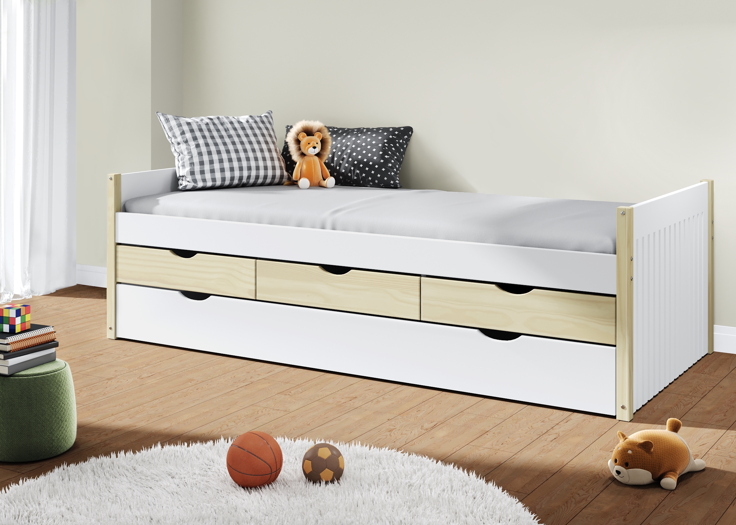 Esta cama compacta con cajones integrados está pensada para aprovechar al máximo el espacio sin renunciar a una estética limpia y actual. Su estructura combina pino y DM, ofreciendo una base robusta y estable para el descanso, con un diseño práctico que incorpora almacenamiento inferior para mantener el dormitorio ordenado. El formato tipo nido con módulos extraíbles facilita guardar ropa de cama, juguetes o prendas de temporada, dejando todo a mano y bien organizado. Es una opción muy funcional para habitaciones juveniles, de invitados o estancias con espacio limitado, ya que integra descanso y almacenaje en una sola pieza, con líneas sencillas y fáciles de combinar.