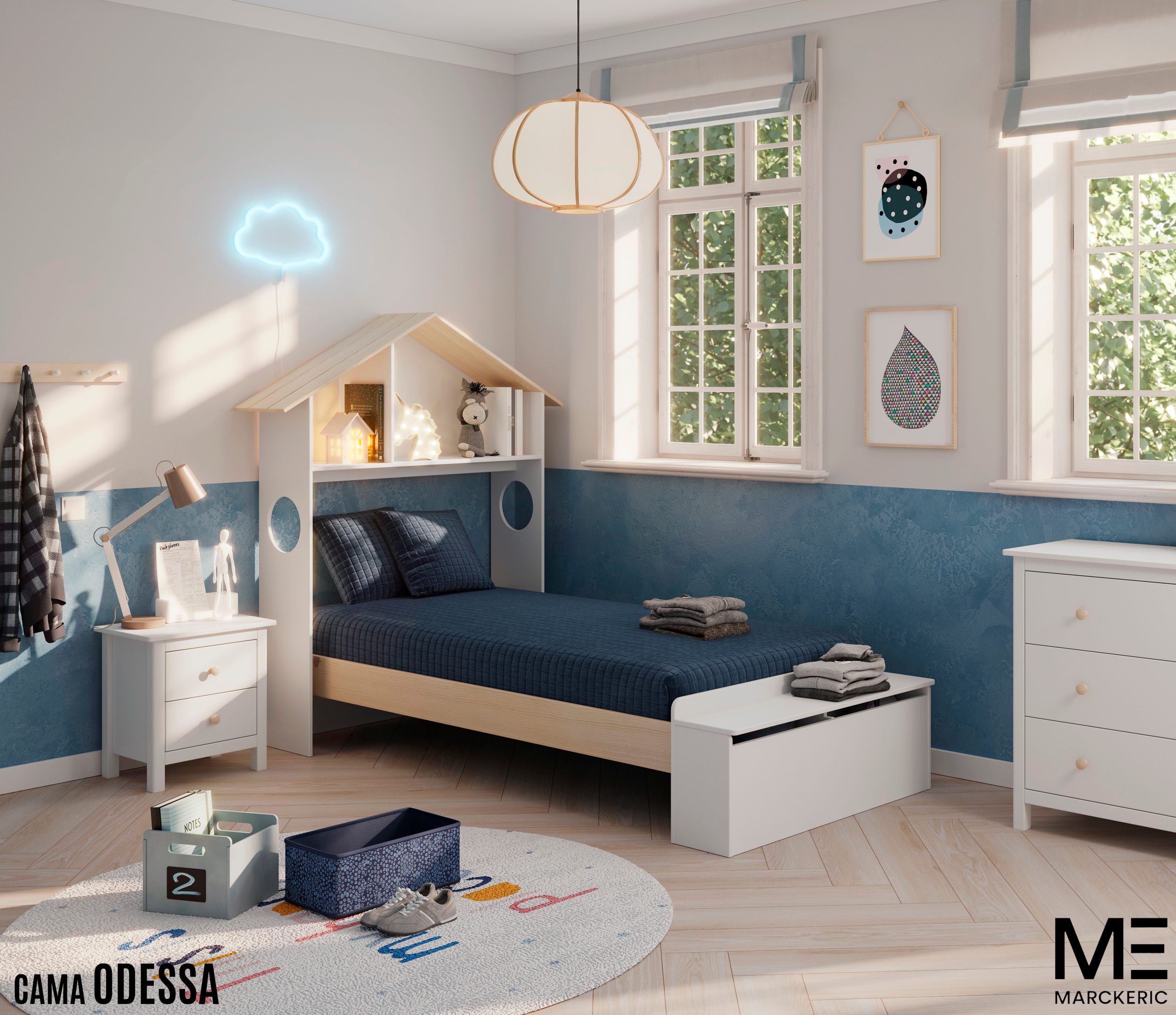 Cama infantil con original diseño de casita, ideal para crear un ambiente acogedor y divertido en el dormitorio. Su estructura robusta ofrece seguridad y confort, mientras la repisa integrada permite tener a mano libros, juguetes o una luz de noche. Los laterales con formas redondeadas y ventanas aportan un toque decorativo muy atractivo, favoreciendo el juego simbólico y la imaginación. El cajón frontal proporciona un práctico espacio extra para guardar ropa de cama o juguetes, ayudando a mantener la habitación ordenada. Es una cama funcional y decorativa, perfecta para acompañar el crecimiento de los peques con estilo y comodidad.