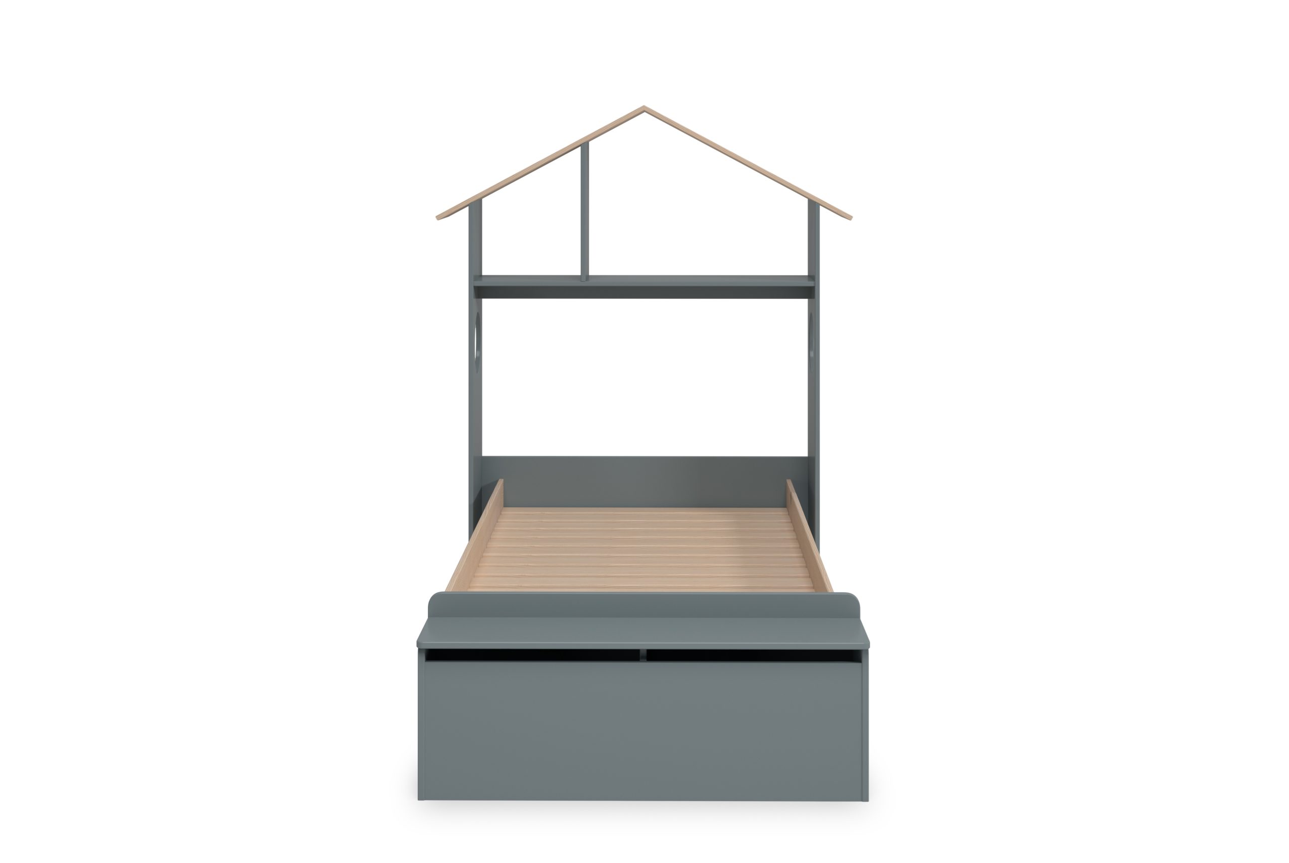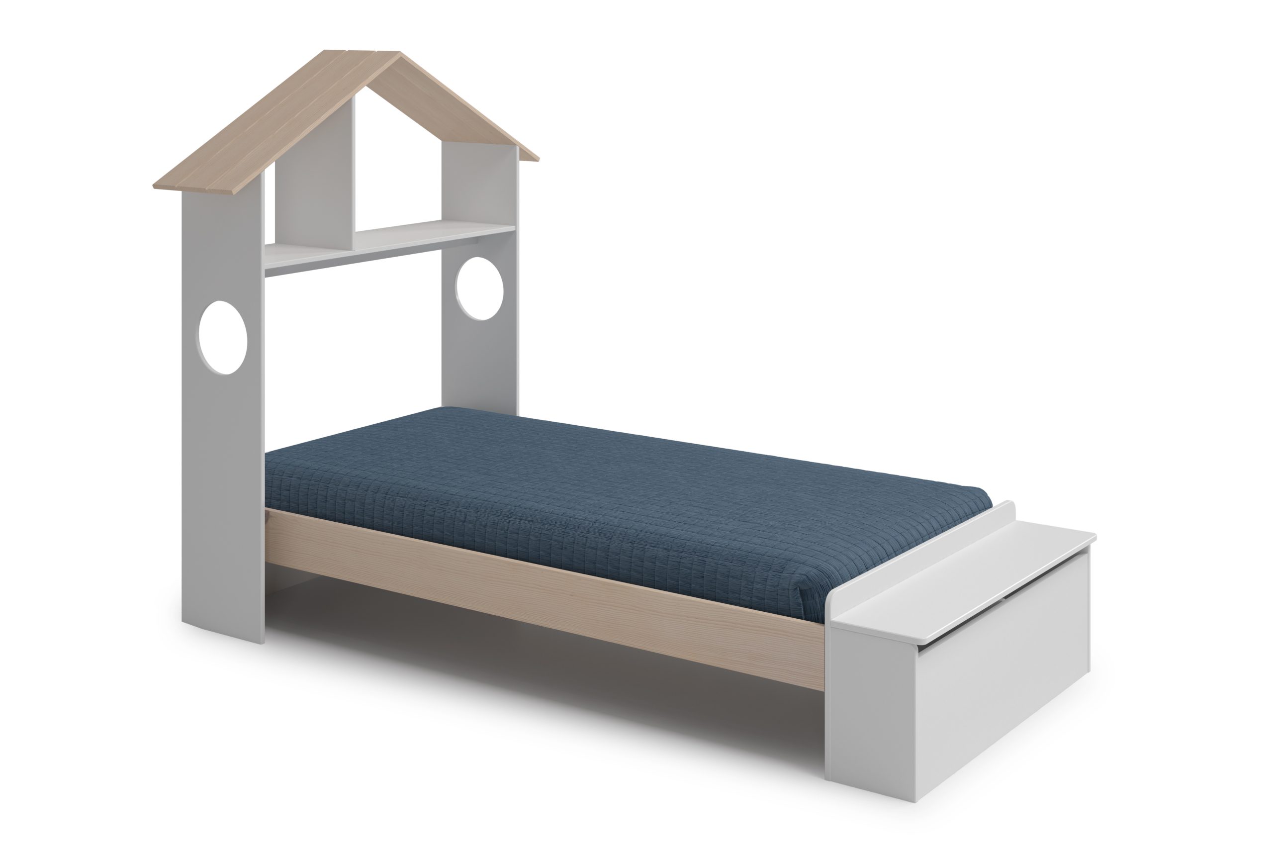 Cama infantil con forma de casita, con estante superior y cajón frontal integrado, diseñada para colchón de 90×190 cm, que combina descanso, almacenamiento y un toque lúdico en el dormitorio infantil.