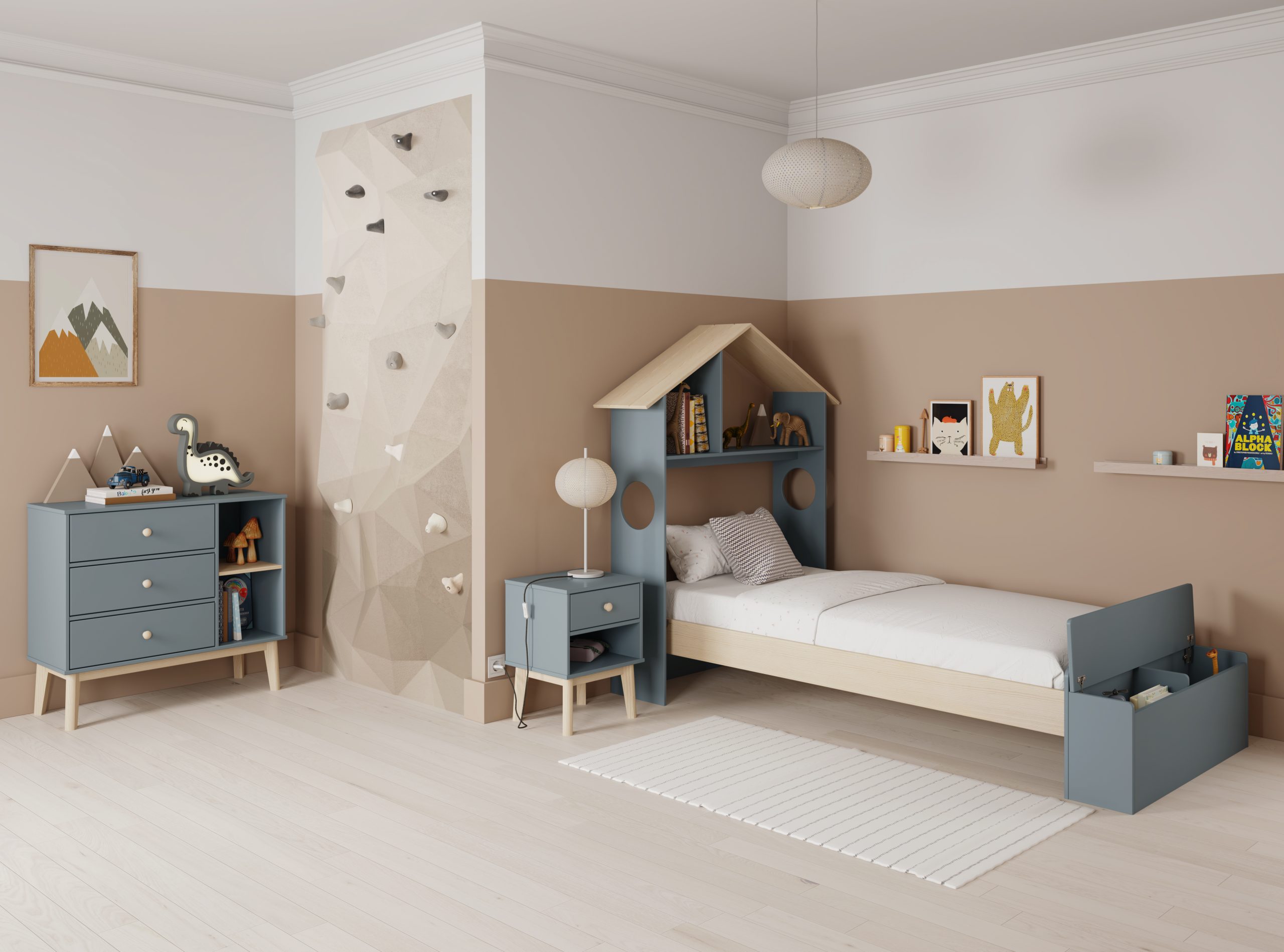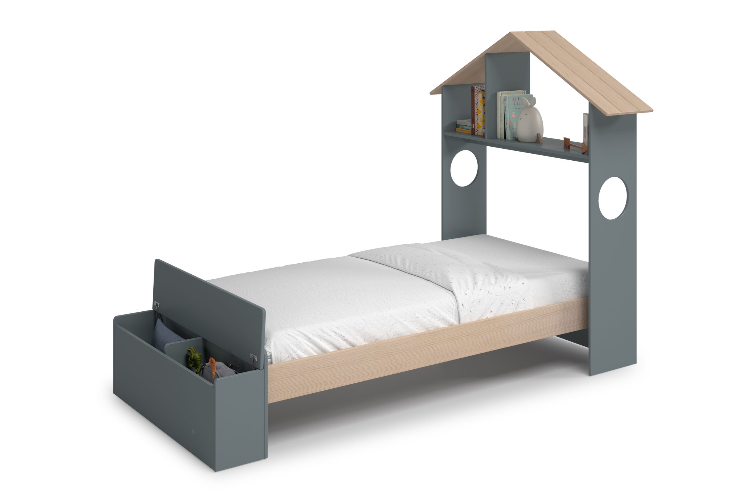 Ofrece un espacio de descanso cómodo, incorpora almacenaje extra y su diseño de casita convierte el dormitorio en una zona de juego y lectura muy acogedora.