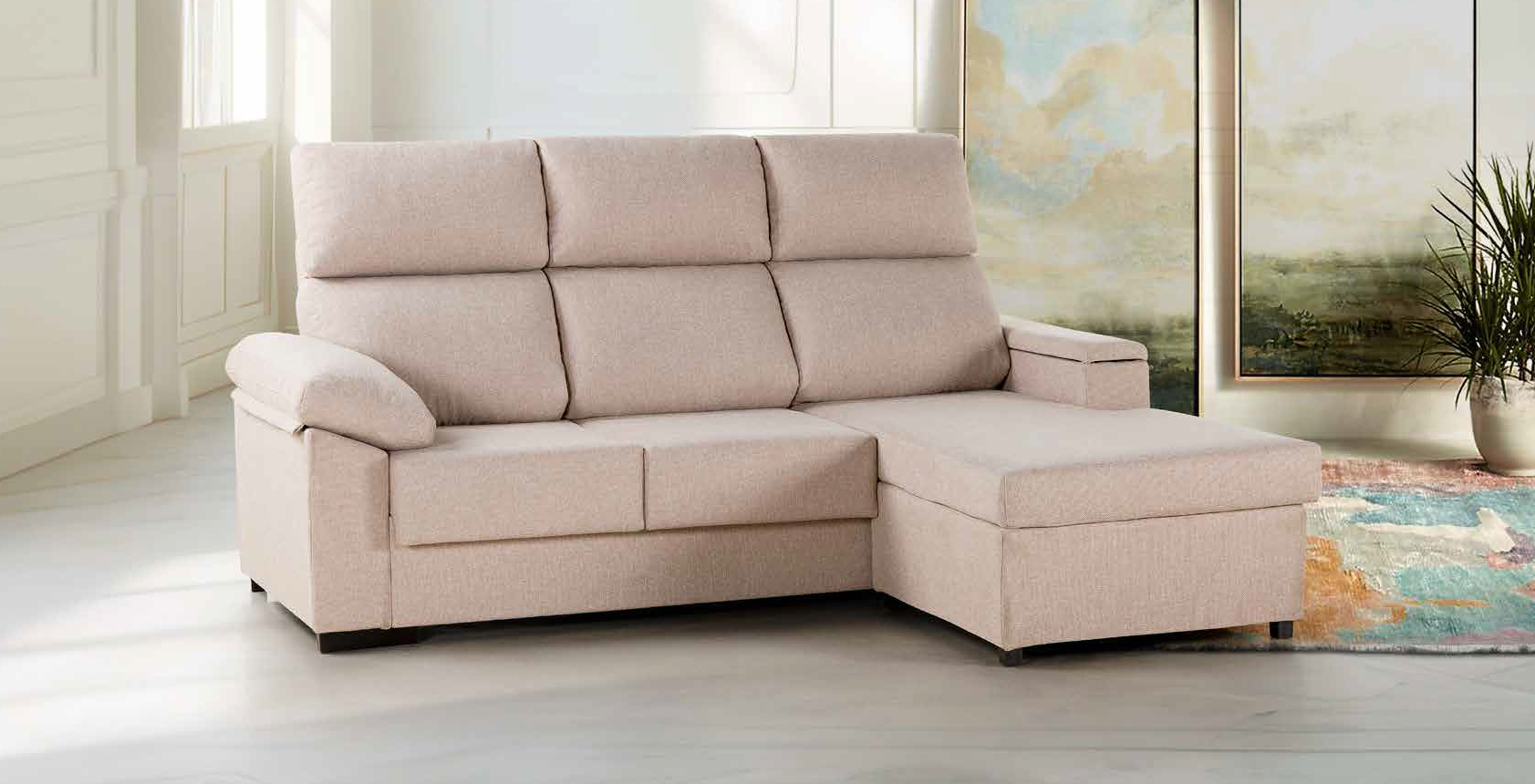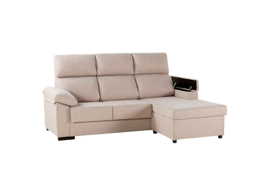 Sofá chaiselongue tapizado en tono beige, con respaldo reclinable y brazo derecho con compartimento abatible para almacenaje. Diseño moderno y funcional, ideal para salones contemporáneos.