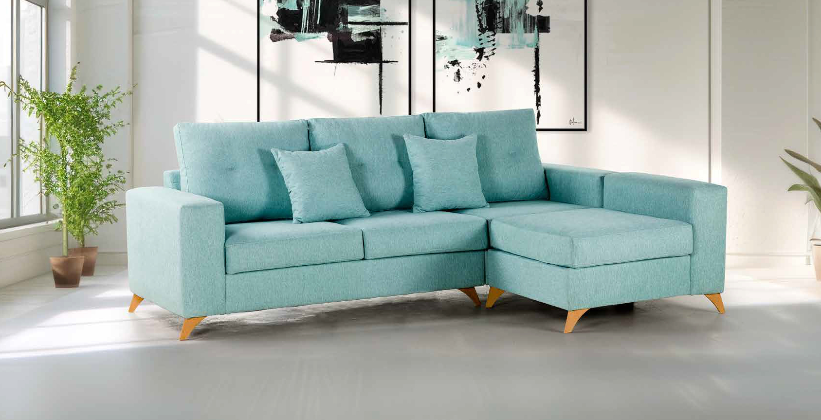 El sofá con Chaiselongue Fiordo es un modelo moderno, de líneas rectas y diseño minimalista, ideal para ambientes contemporáneos. Su tapizado en tono azul claro transmite frescura y tranquilidad, además de aportar un toque de color sin resultar estridente. Está compuesto por tres plazas principales y un módulo chaiselongue a la derecha que ofrece mayor comodidad para estirarse o relajarse. Incluye tres cojines decorativos para maximizar el confort y su base de patas de madera en tono natural le añade calidez y estabilidad. Es perfecto para salones amplios, combinando estilo y funcionalidad, siendo fácil de integrar en diferentes estilos de decoración.