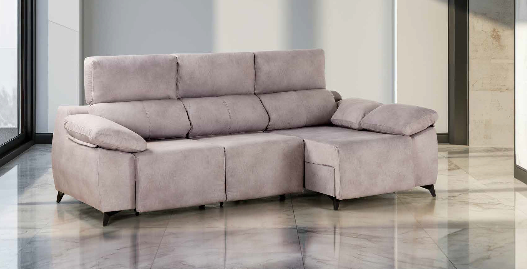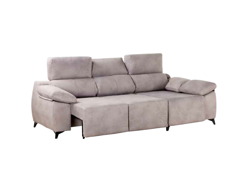 El sofá con Chaiselongue Martina es un modelo moderno y funcional, con tapizado en tono gris claro y diseño minimalista. Destaca por sus respaldos altos y acolchados, así como los reposabrazos suaves y confortables. Incluye un mecanismo extensible en la zona de los asientos, permitiendo convertirlo en una superficie más amplia ideal para relajarse o dormir ocasionalmente. Sus patas son bajas y discretas, lo que aporta estabilidad y un toque elegante. Este tipo de sofá es perfecto para salones contemporáneos, combinando comodidad y estilo en cualquier espacio del hogar.