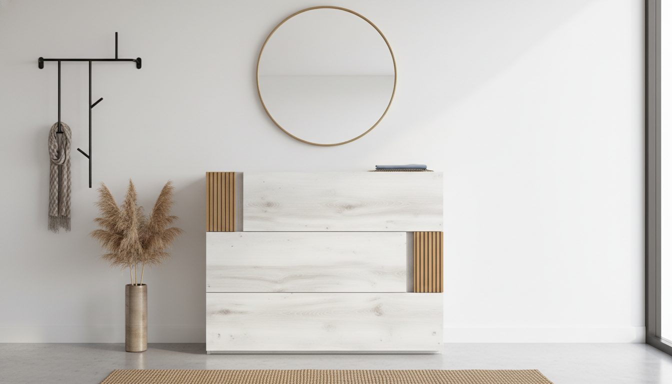 Cómoda de diseño contemporáneo con líneas rectas y frentes lisos, que combina un acabado claro con detalles de listones decorativos en contraste para aportar personalidad al dormitorio o salón. Ofrece gran capacidad de almacenamiento en sus cajones amplios, manteniendo un aspecto elegante y ligero que encaja en ambientes modernos y minimalistas.