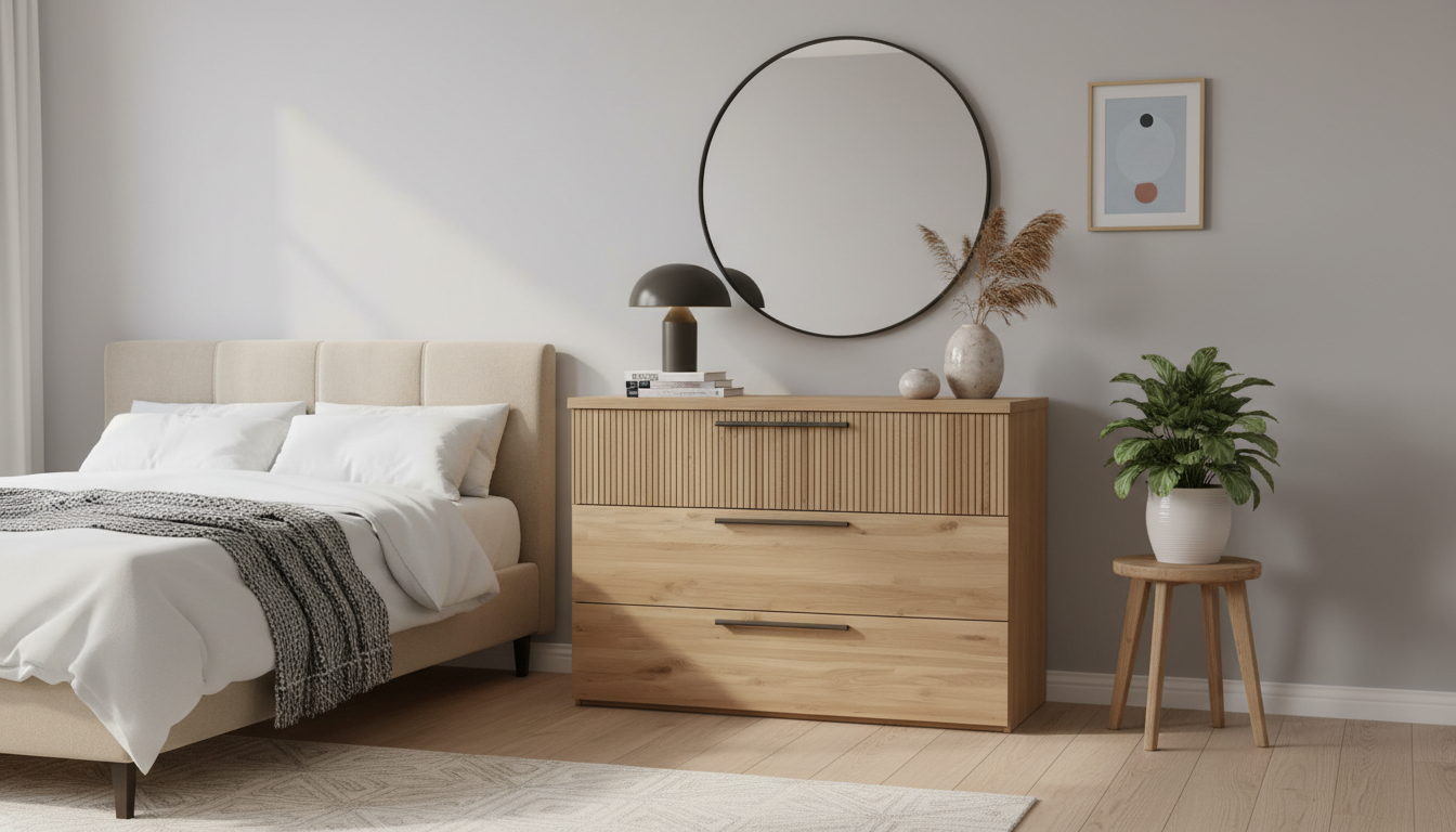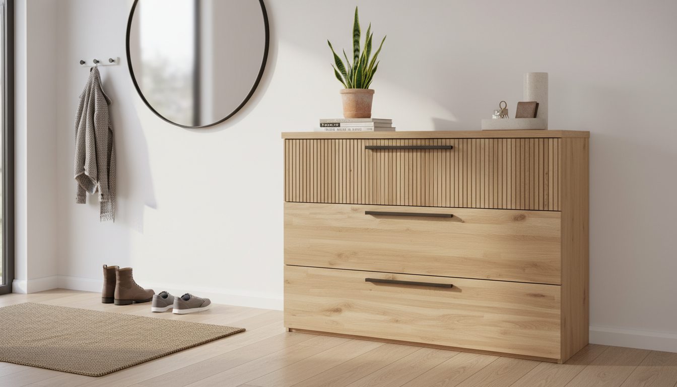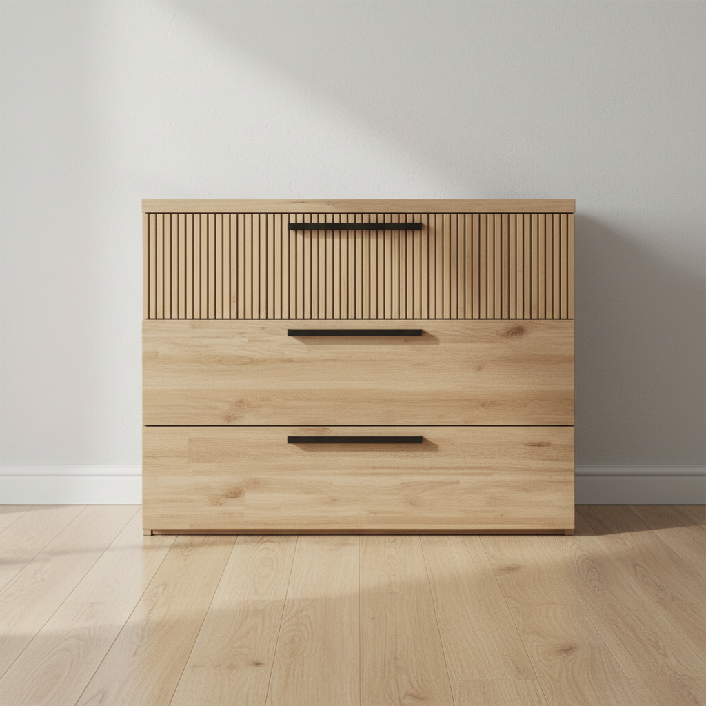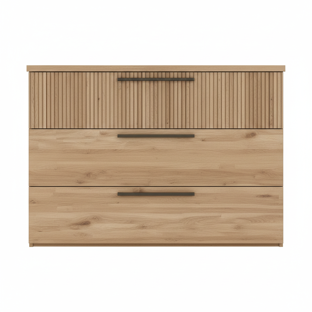 Cómoda de líneas modernas con tres amplios cajones, ideal para dormitorios actuales o espacios multifuncionales del hogar. Su diseño combina frentes lisos con un original efecto acanalado en el cajón superior, creando un aspecto elegante y atemporal. Los tiradores alargados aportan un toque contemporáneo y facilitan la apertura suave de los cajones, pensados para organizar ropa, complementos u otros objetos cotidianos. Fabricada en panel de partículas y fibras de madera con recubrimiento decorativo, ofrece una superficie resistente y fácil de limpiar para el uso diario en el hogar.