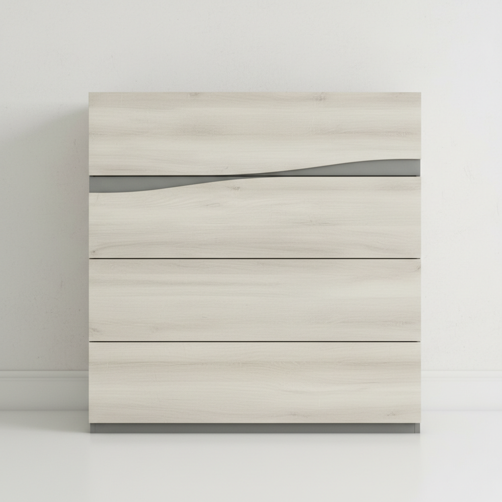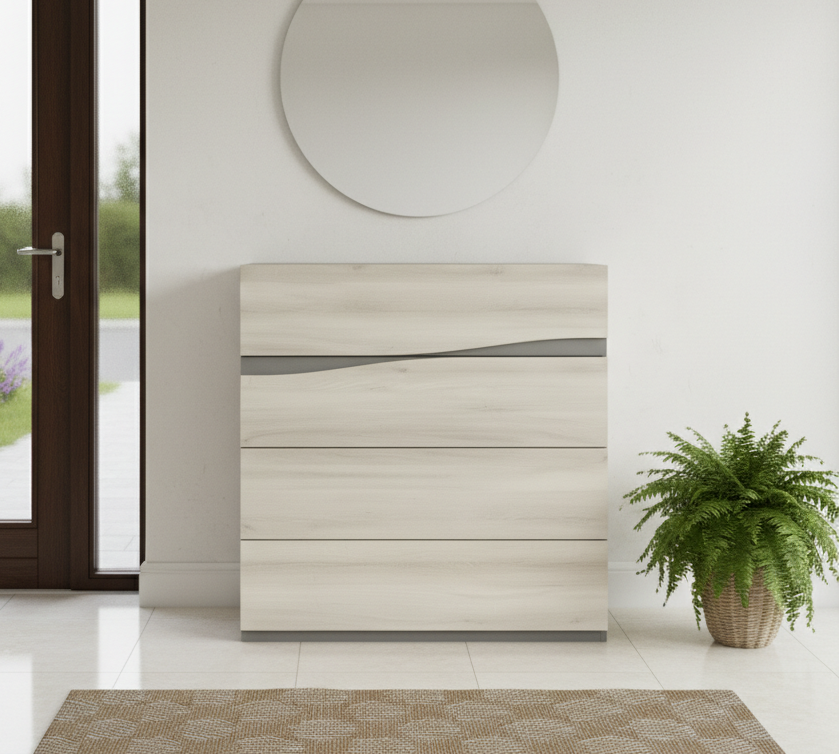 Cómoda de estilo contemporáneo con tres cajones amplios y frontal ondulado decorativo. Ofrece gran capacidad de almacenamiento y una estructura sólida, perfecta para dormitorios y zonas de estar que buscan orden, funcionalidad y un toque actual.