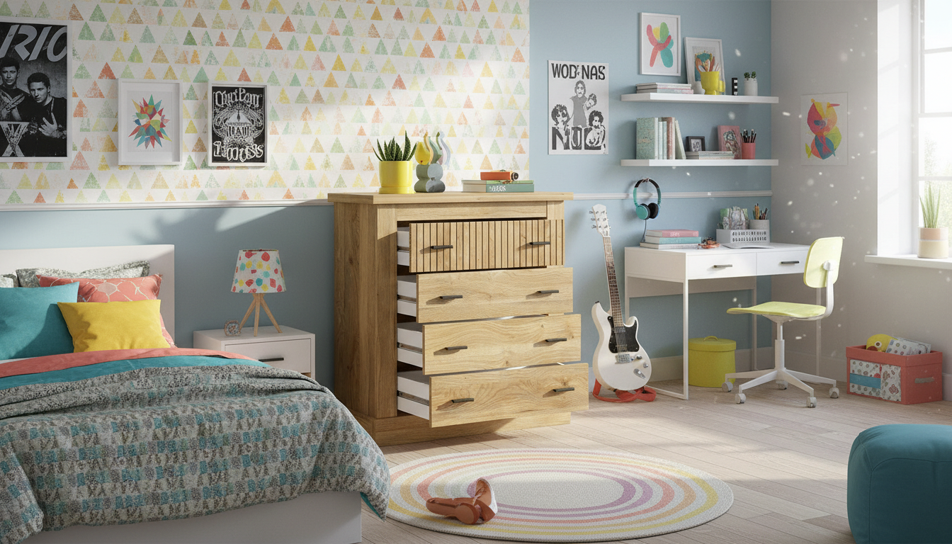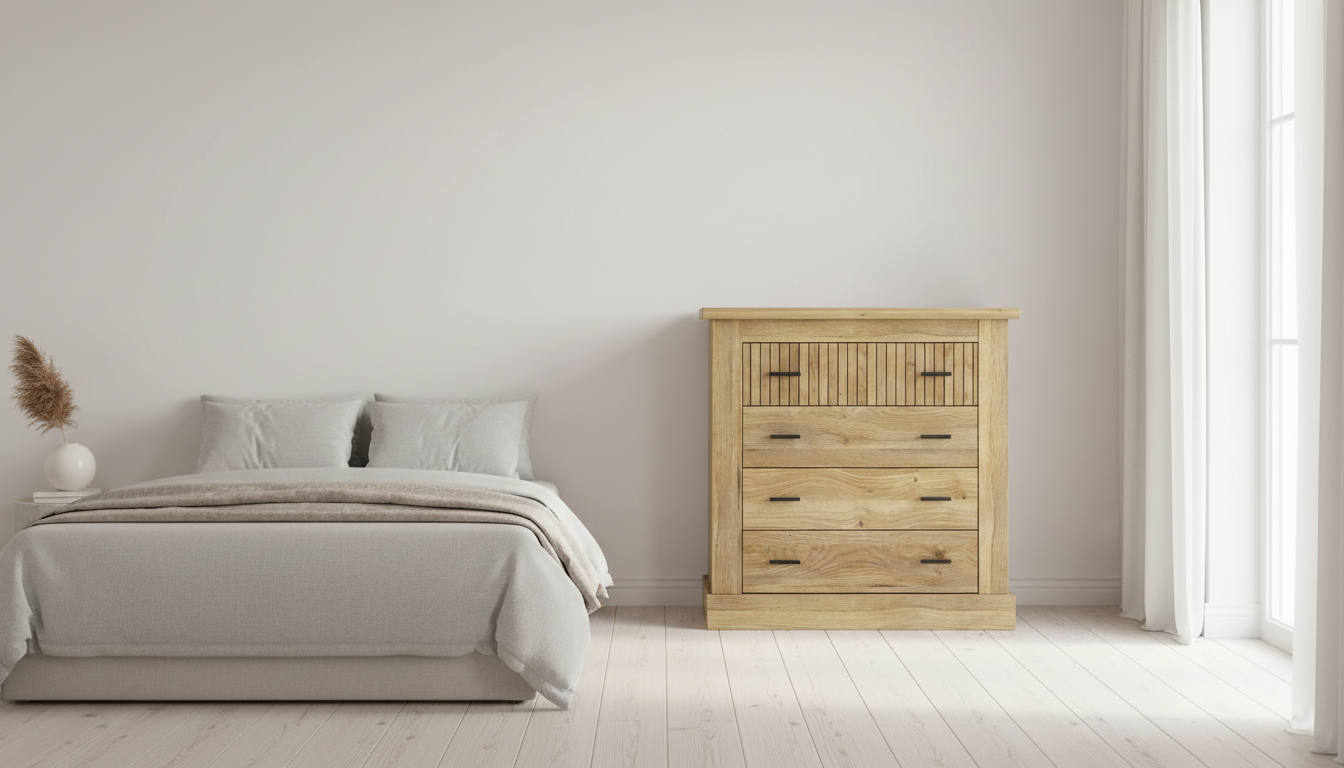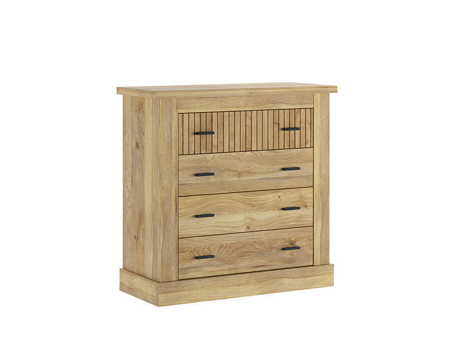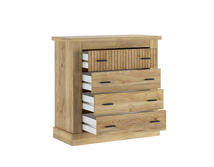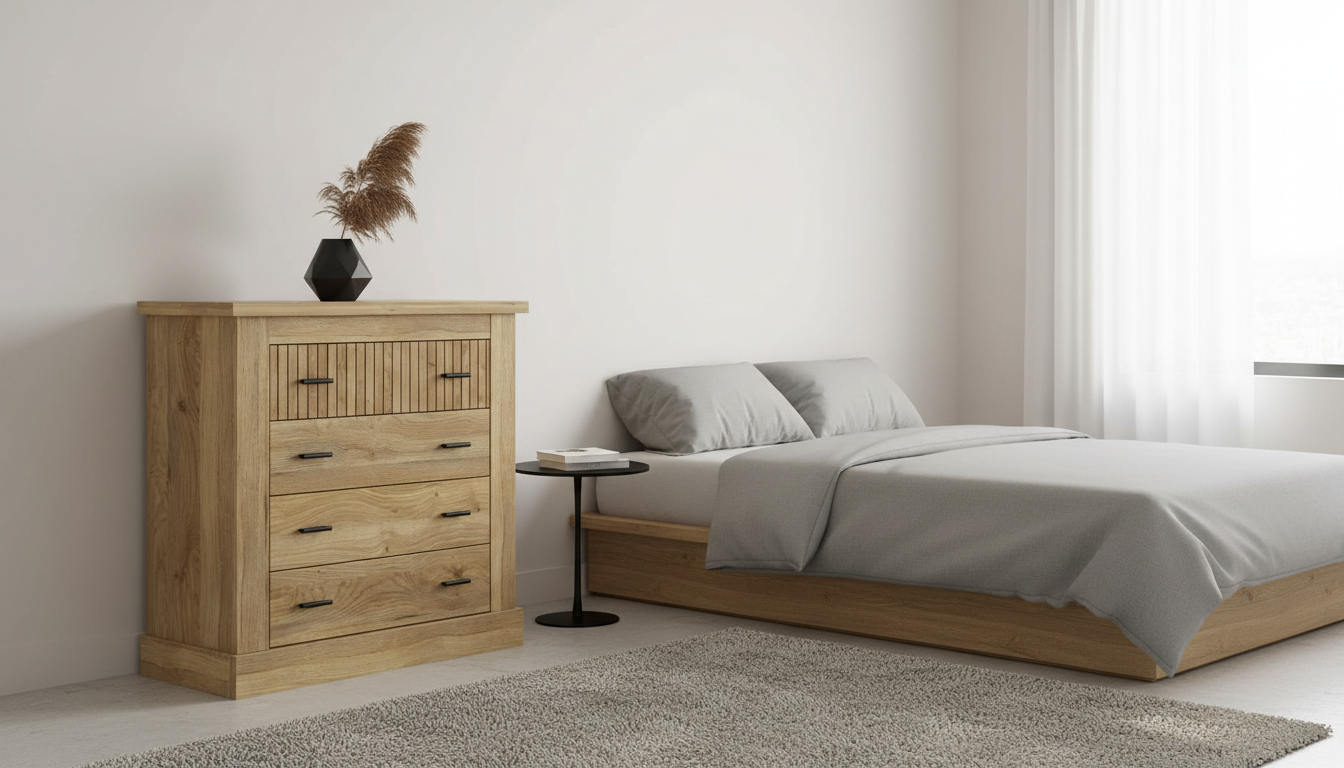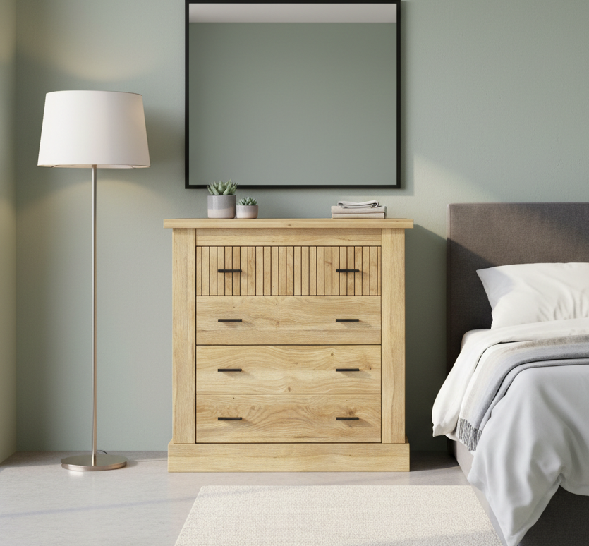 Cómoda de estilo actual, con un diseño limpio que encaja fácilmente en dormitorios y recibidores. Ofrece gran capacidad de almacenaje gracias a sus cajones espaciosos y de suave deslizamiento. El frente superior incorpora un original detalle acanalado que aporta un toque decorativo muy cuidado. Los tiradores rectos le dan un aire moderno y facilitan la apertura diaria. La estructura es robusta y está pensada para un uso continuado en el hogar. La parte superior sirve como superficie de apoyo para lámparas, marcos de fotos u otros objetos decorativos, creando un ambiente ordenado y acogedor en cualquier estancia.