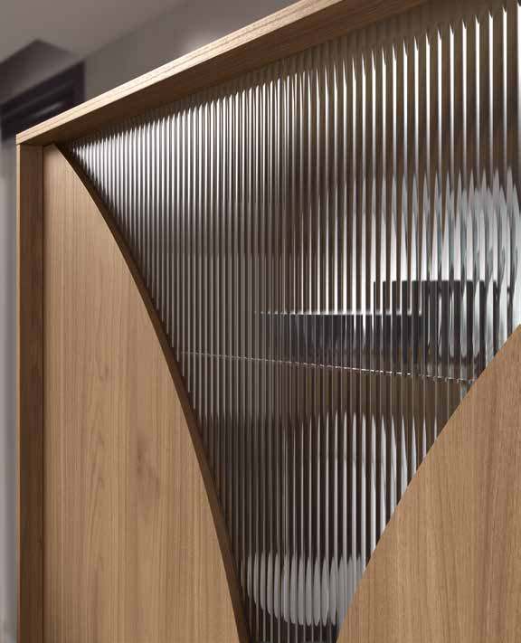 Mueble modular de salón de estilo moderno, fabricado en madera natural con detalles geométricos y acabados en vidrio estriado. Ideal para crear ambientes acogedores y elegantes, ofrece amplio espacio de almacenamiento y soporte para televisor, combinando funcionalidad y diseño actual.