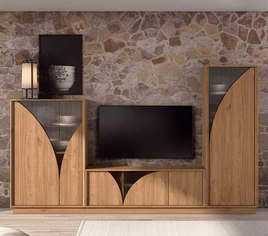 El conjunto modular de salón Aire 43009 está diseñado en madera natural con acabado en tonos cálidos y detalles de líneas curvas que aportan un toque moderno y elegante. Incorpora vitrinas con puertas parcialmente acristaladas, lo que permite exponer objetos decorativos o vajilla mientras los protege del polvo. Su estructura se compone de diferentes módulos: una vitrina alta, un bajo para televisión y una vitrina adicional a la izquierda, todos integrados sobre una base uniforme. La combinación de paneles opacos y transparentes, junto al diseño geométrico, lo convierte en una pieza funcional y estética, ideal para ambientes contemporáneos.